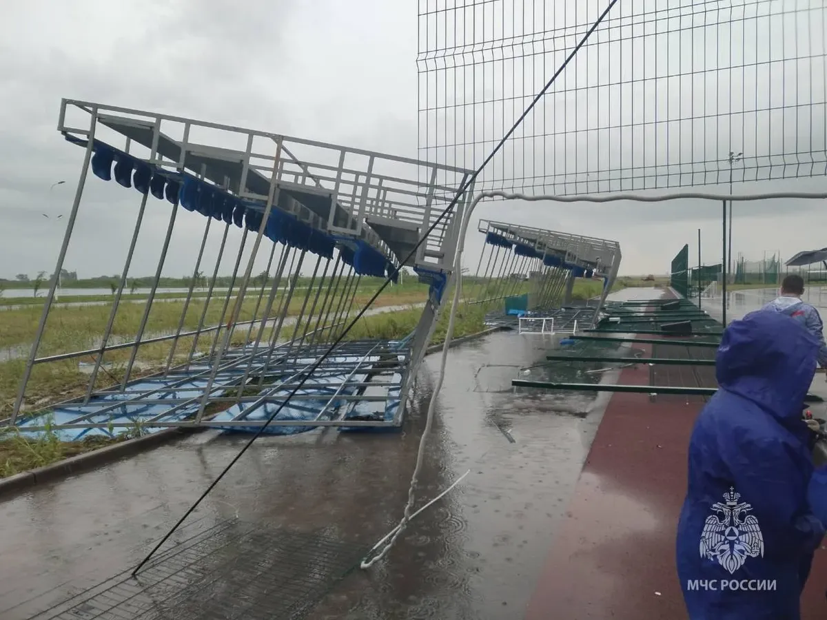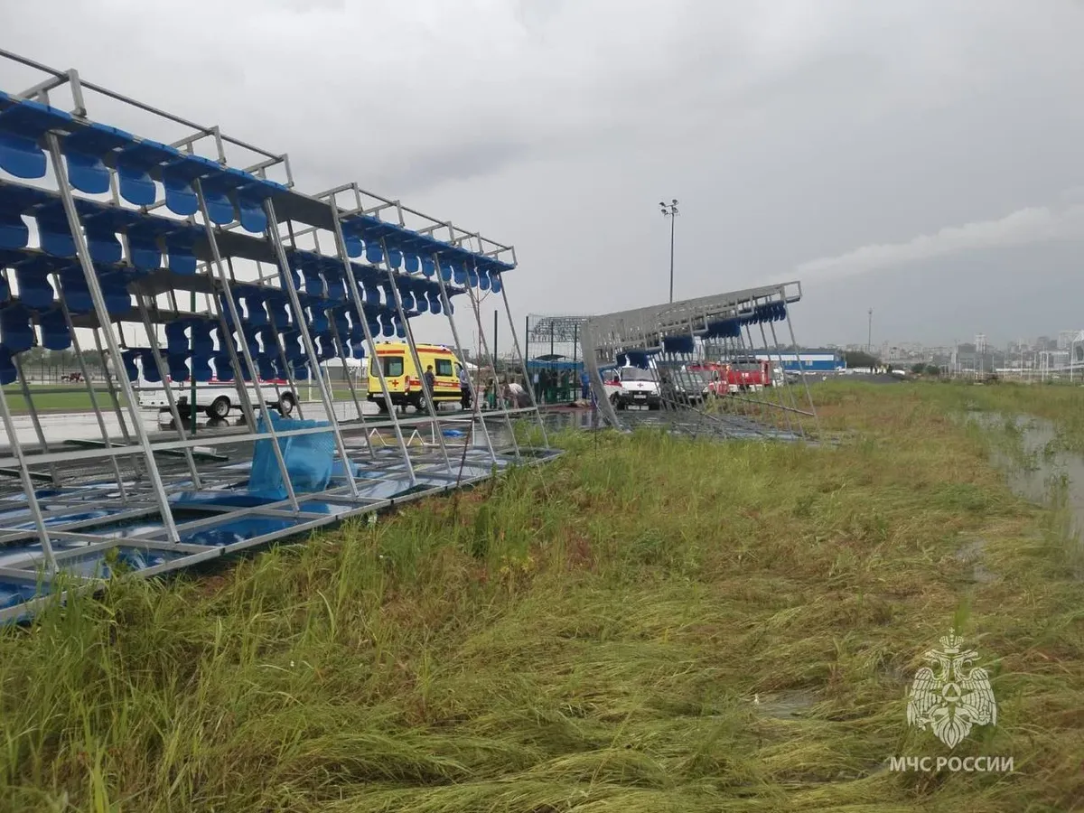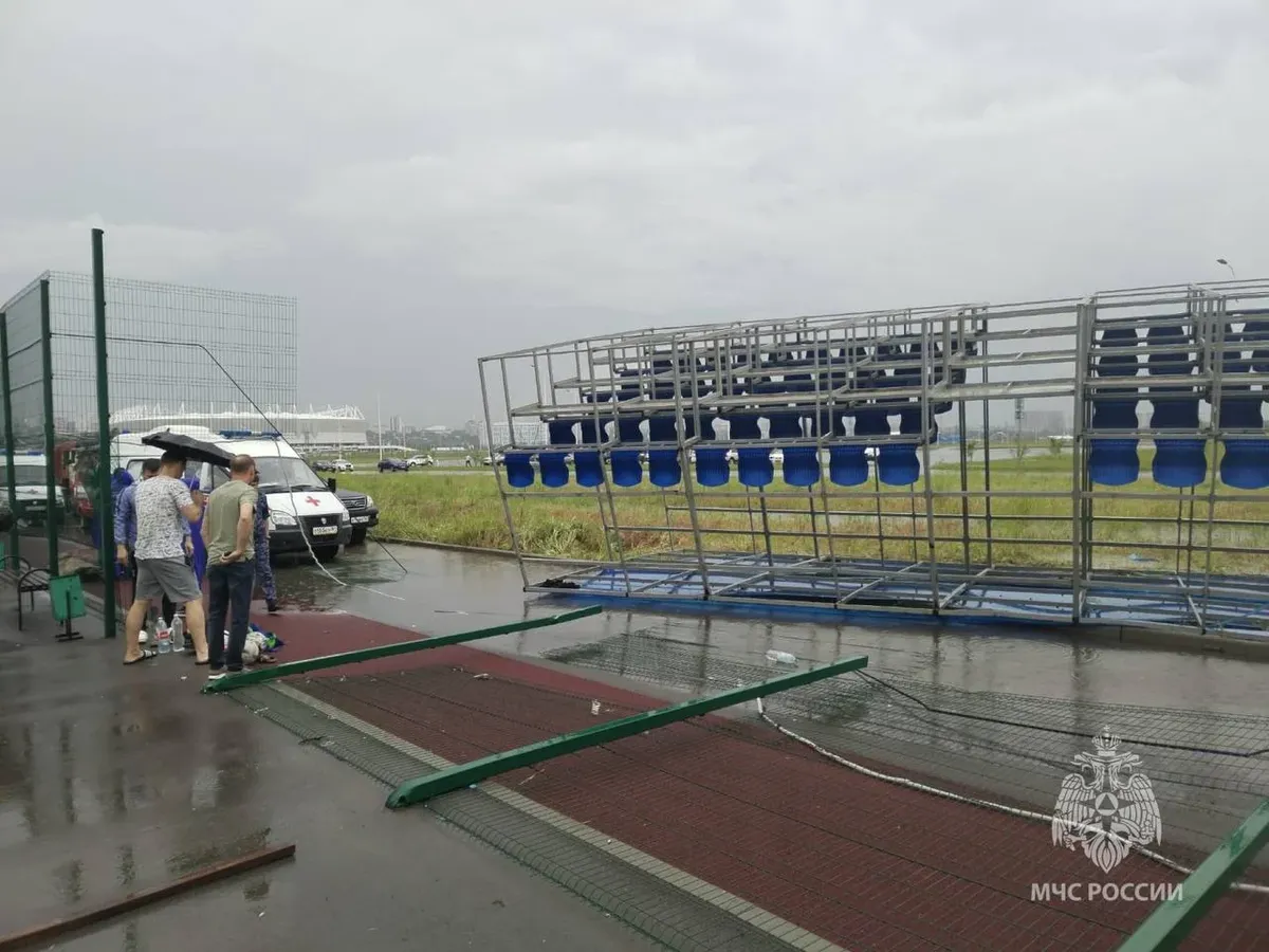 Женщину задавило металлической трибуной на детском спортивном турнире по футболу, который проходил несмотря на штормовое предупреждение. Это уже второй случай гибели горожан из-за непогоды в столице ЮФО.