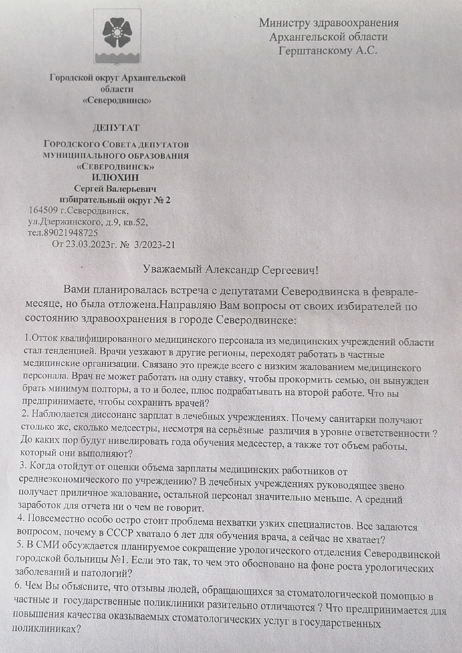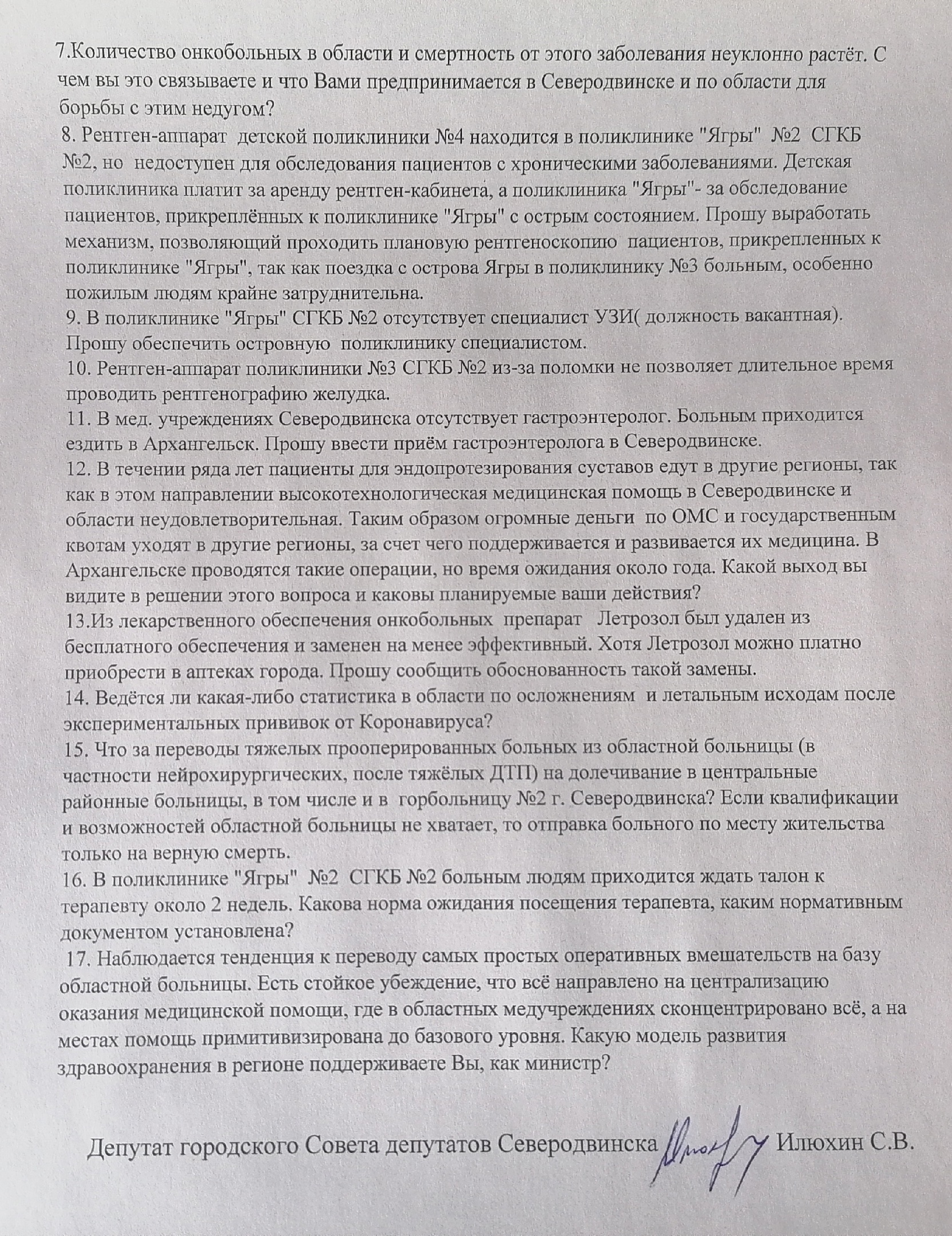 Поступает много вопросов от северодвинцев и избирателей по обеспечению здравоохранения в нашем городе, в том числе и в поликлинике «Ягры». Постарался их систематизировать и включил в мой депутатский запрос министру здравоохранения области Александру Герштанскому. Общий вывод из полученного ответа, с которым вы можете ознакомиться ниже: региональное руководство живет в каком-то ином измерении, и у него все идет по плану...