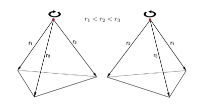 Что такое четырехточечная корреляция и почему именно она используется для определения зеркальной симметрии Вселенной? Дело в том, что тетраэдр — минимальная фигура, для которой можно ввести понятия «левый» и «правый». Для равностороннего тетраэдра это невозможно, а если все стороны разные — то вполне. Берем самую длинную сторону и вершину А на ней, к которой примыкает вторая по длине сторона. Далее вращаем фигуру вокруг длинного ребра от второго по длине ребра к более короткому, примыкающему к вершине А. Если, глядя со стороны А, получается вращение по часовой стрелке, называем тетраэдр «правым», если против — то «левым».