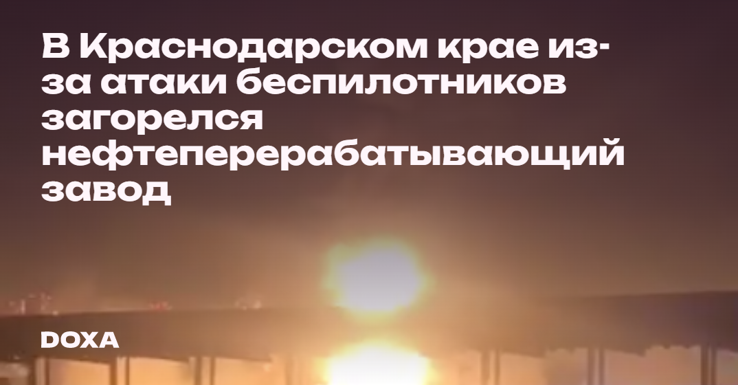 Ночью Афипский нефтеперерабатывающий завод в Краснодарском крае загорелся из-за атаки беспилотников. Пожар потушили, из-за огня никто не пострадал, сообщил губернатор региона Вениамин Кондратьев. Также ТАСС сообщил, что утром на территории Ильского нефтеперерабатывающего завода также упал беспилотник, но предприятие не загорелось.