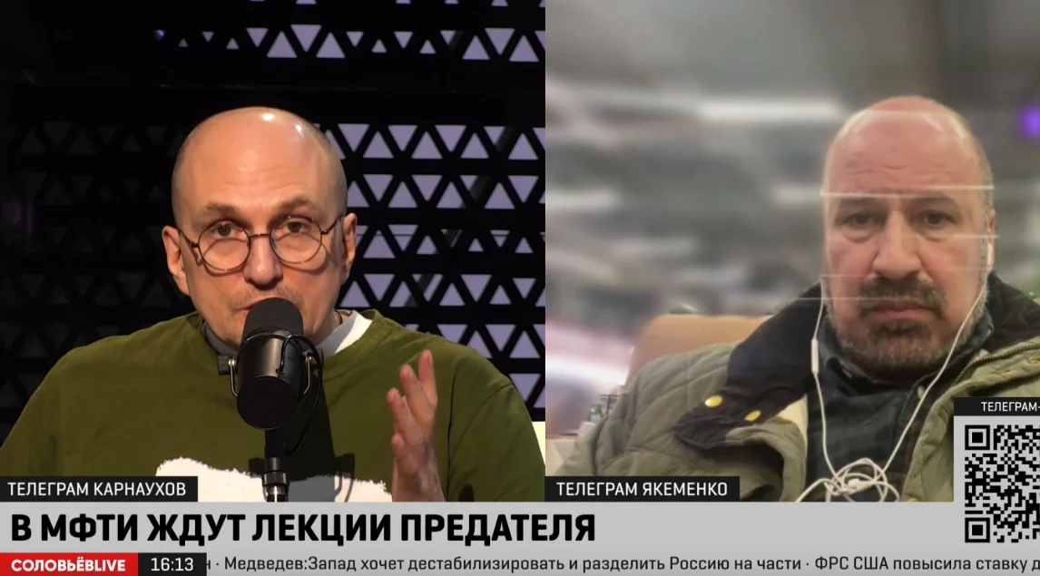 Именно такое предложение — избить при встрече — в программе «Лабиринт Карнаухова» на канале «Соловьев Live» 23 марта сделал неограниченному кругу своих зрителей Борис Якеменко — публицист, брат создателя «Идущих вместе», основатель «православного корпуса движения «Наши». А ведущий Сергей Карнаухов (юрист, бывший милиционер и бывший зампред правительства Кировской области) это предложение не только не отверг, но и горячо поддержал.