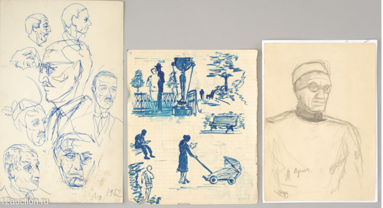 Лот для специального аукциона в поддержку журнала "Звезда": Иосиф Бродский, зарисовки 1962-1964 гг. Рисунок "Врач" сделан после 18 февраля 1964 г., когда суд постановил направить поэта на принудительную судебно-психиатрическую экспертизу в ленинградскую психиатрическую больницу № 2 (на "Пряжке")