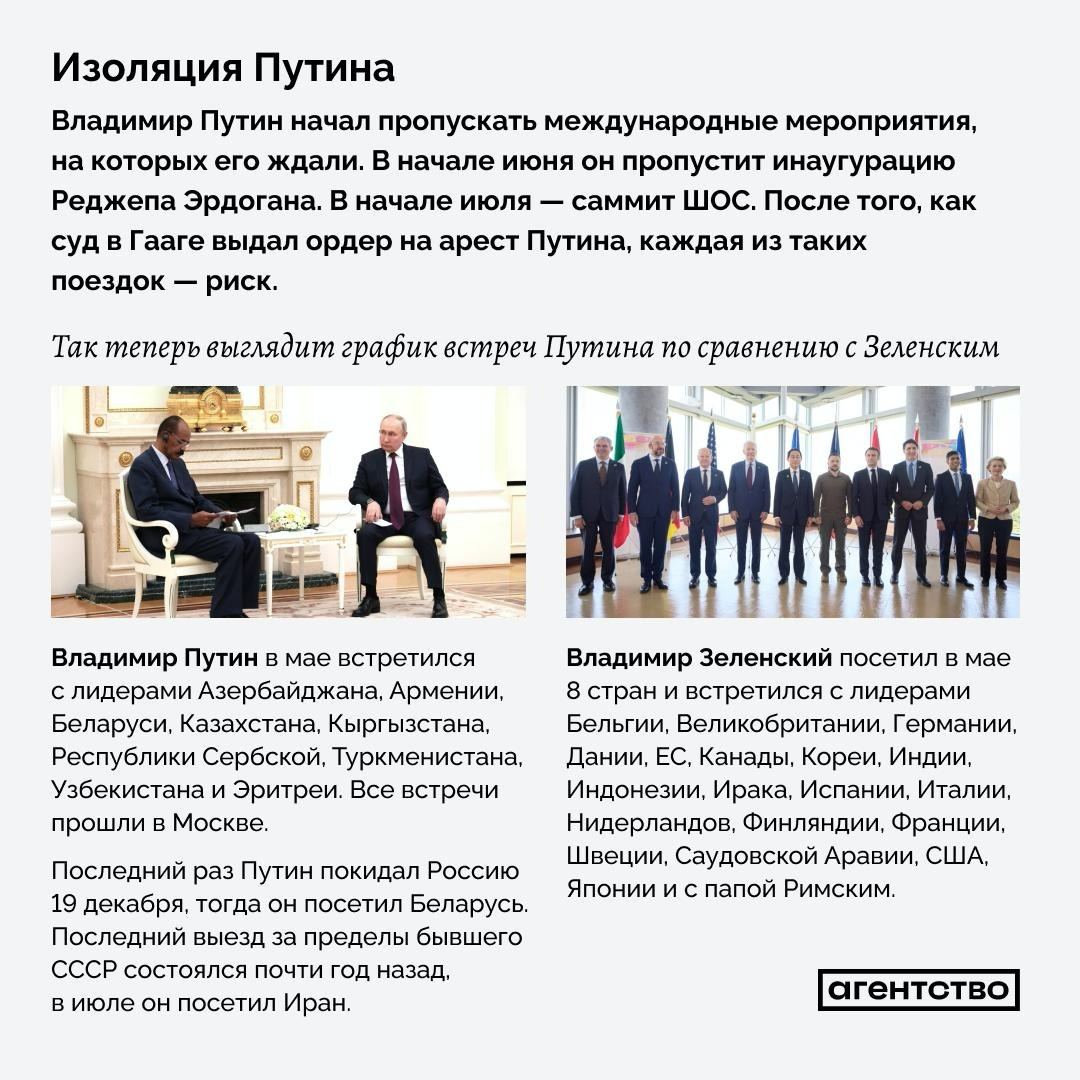 - Из-за отказа от международных поездок Путин становится все более изолированным. В мае он встречался в основном с лидерами стран бывшего СССР. Исключениями стали президенты Эритреи Исайяс Афеворки и Республики Сербской Милорад Додик. Все встречи прошли в Москве.
