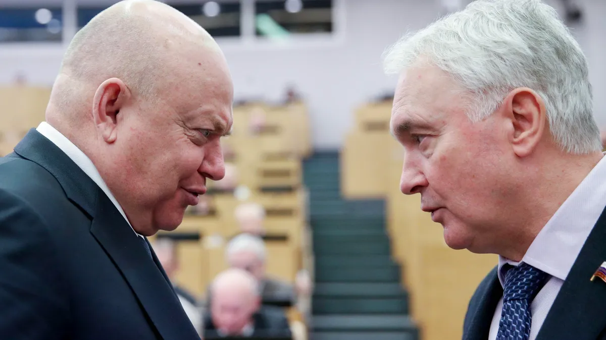 Первый заместитель председателя комитета Госдумы РФ по обороне Андрей Красов и председатель комитета Госдумы РФ Андрей Картаполов (слева направо). Фото: Марат Абулхатин / Пресс-служба Госдумы РФ / ТАСС