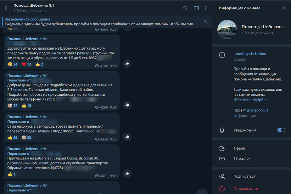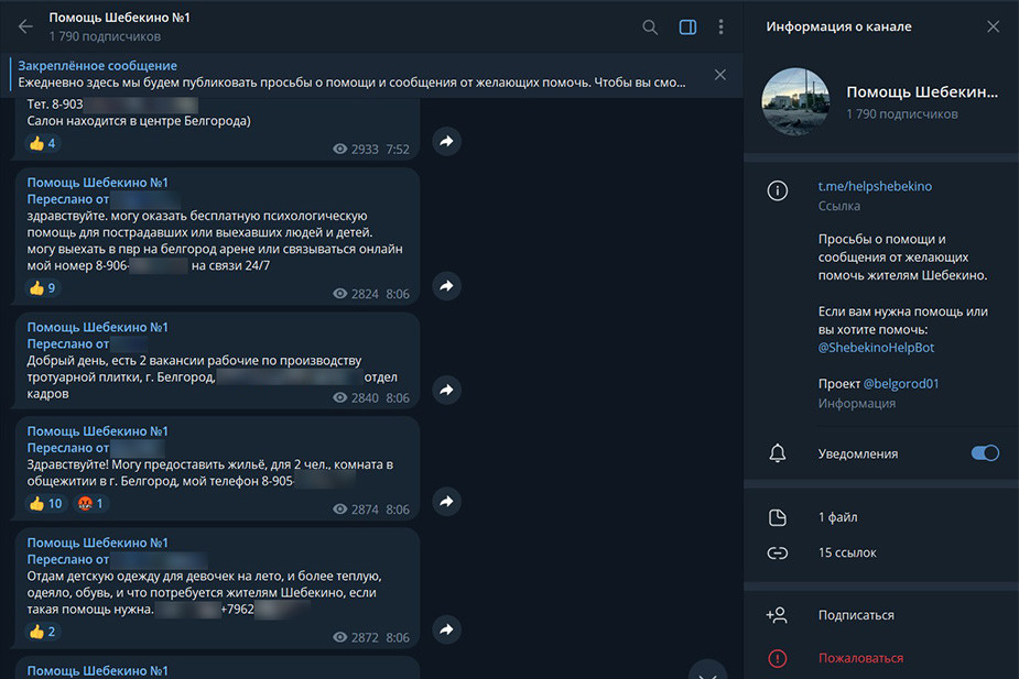 Среди постов в канале — вакансии, предложения приютить в своем доме или квартире, психологическая поддержка жителей приграничья. Кроме белгородцев помощь предложили жители Урала, Краснодарского края, Нижегородской области, Тюменской области, Москвы, Воронежа и не только. Меньше чем за сутки на канал подписались почти 2 тыс. человек. В том же чате появилось объявление о сборе гуманитарной помощи, одежды, средств гигиены, продуктов. Жители Белгорода в соцсетях писали, что готовы приехать в Шебекино и забрать оттуда людей.