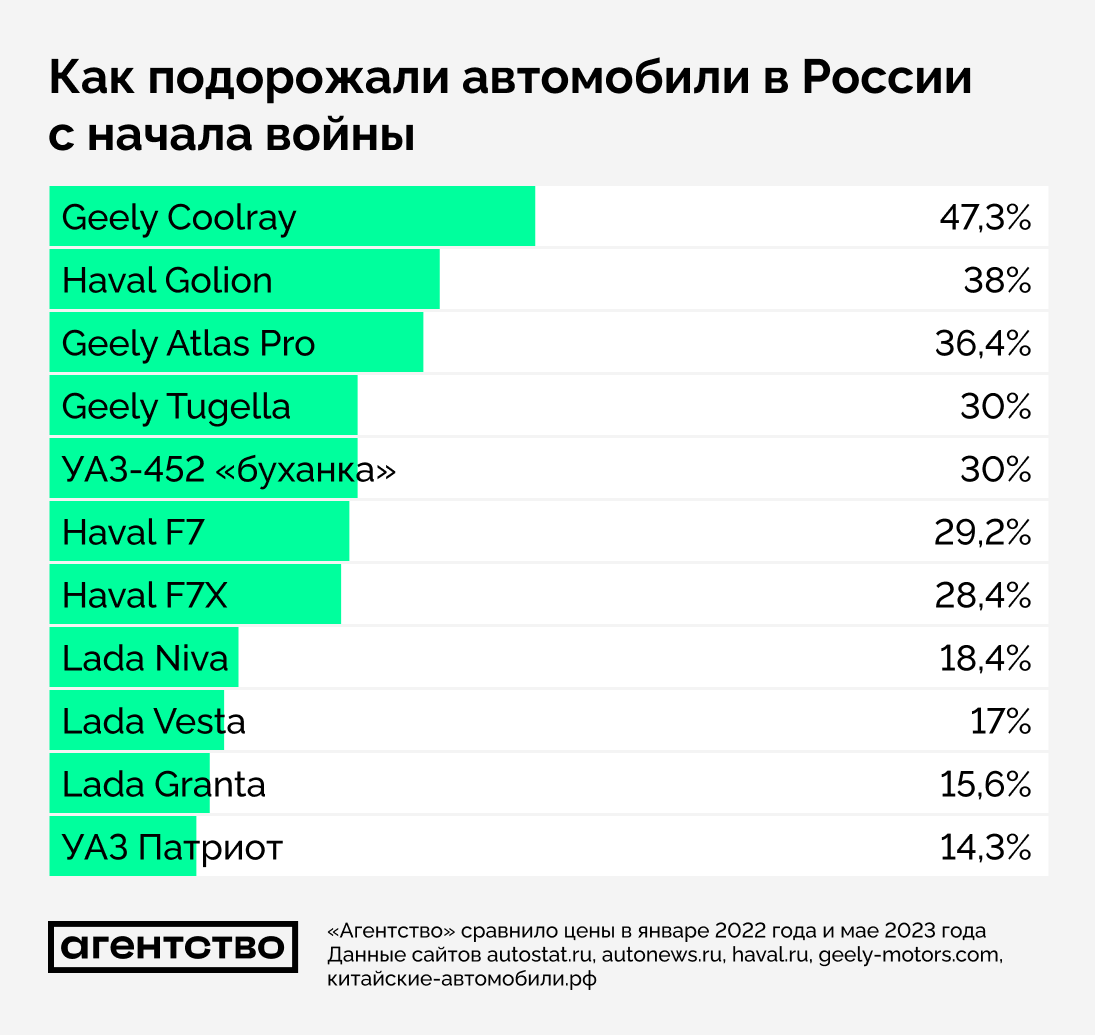 - Из самых продаваемых моделей в лидерах подорожания Geely Coolray (47%), Haval Golion (38%) и Geely Atlas Pro (36%, все — Китай). Среди российских моделей, динамику цен на которые проанализировало «Агентство», больше всего выросли цены на УАЗ «буханку» (30%), Lada Niva (18%) и Lada Vesta (17%).