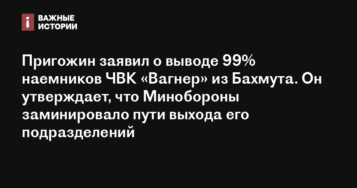 Пригожин заявил о выводе 99% наемников ЧВК «Вагнер» из Бахмута. Он утверждает, что Минобороны заминировало пути выхода его подразделений