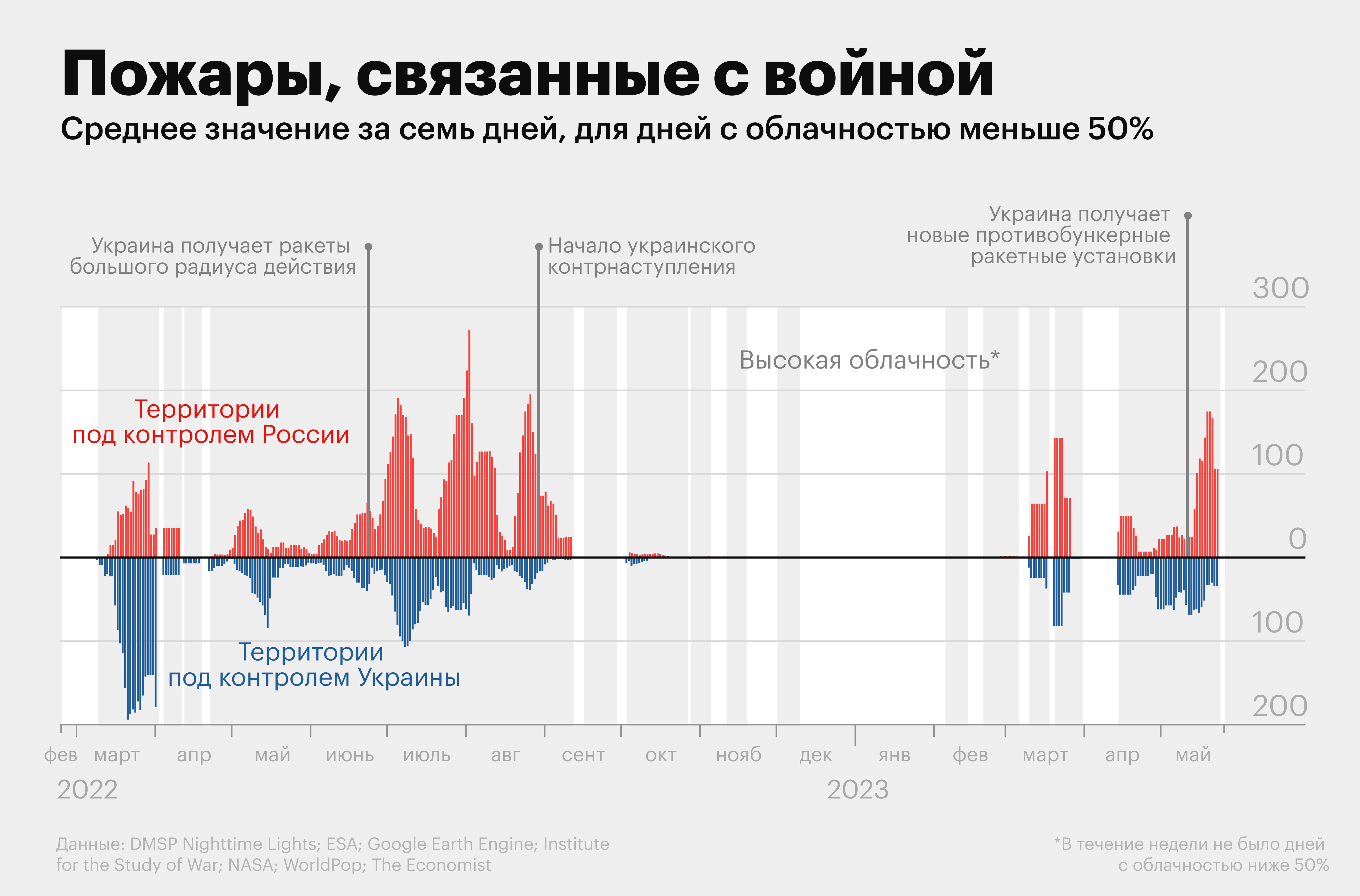 Резкий рост числа пожаров начался 11 мая. Есть основания полагать, что именно в этот день Украина впервые использовала Storm Shadow — малозаметные крылатые ракеты большой дальности, поставленные Великобританией. Среднее число «военных» пожаров на территориях, которые удерживает Россия, сейчас достигло самого большого значения со 2 августа 2022 года — в сутки их фиксируется больше сотни. (Впрочем, эти числа дают лишь общее представление об активности боевых действий: спутники не могут выявить все пожары, а более крупные возгорания иногда фиксируются как череда более мелких.)
