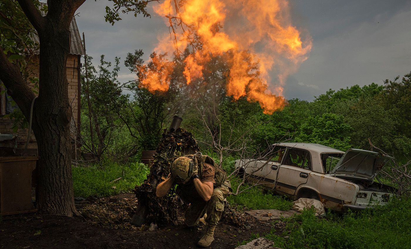 Украинский солдат ведет огонь из миномета по российским позициям возле Бахмута, Донецкая область, Украина, 28 мая 2023 года. Фото: Efrem Lukatsky / AP