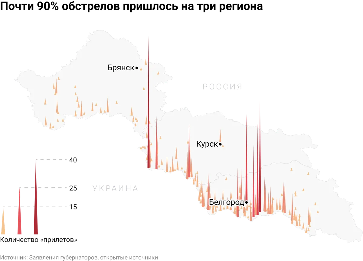 В мае главы регионов сообщили о рекордных 281 обстрелах — это в четыре раза больше, чем месяц назад. В среднем атакам каждый день подвергается 8 населенных пунктов. Целями «прилетов» уже стали более двух тысяч гражданских и промышленных объектов, среди которых нефтебазы, московские многоэтажки и купол Кремля.