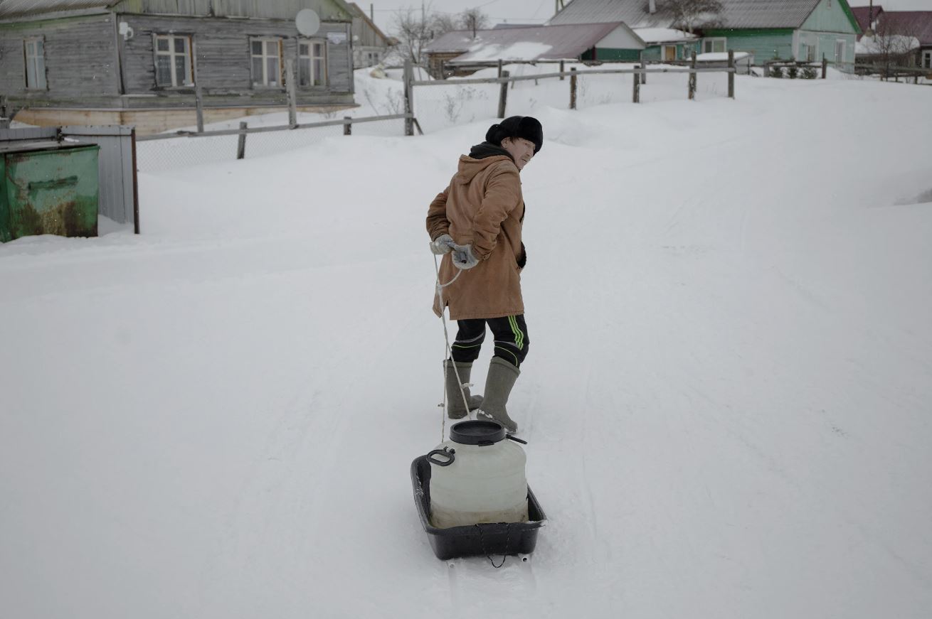 По поселку тяжело пройти из-за высоких сугробов. Мужчина молча тащит по улице сани-водовозку, за ним семенит жена. "Это мы уже второй раз идем", – говорит она. Вода в Красном – "по талонам": чтобы наполнить бочки, на колонке нужно прикладывать магнитную карту.
