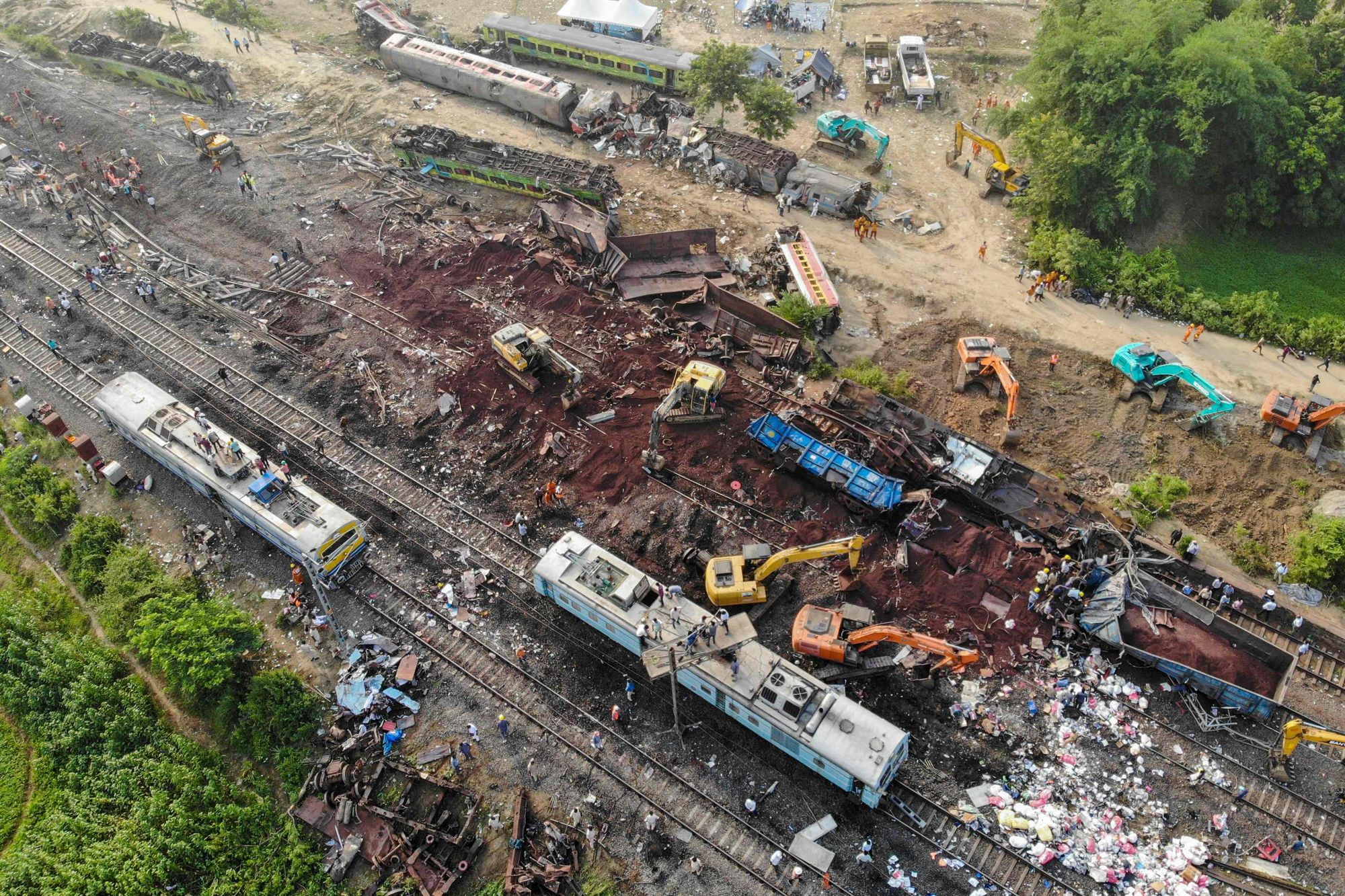 В пятницу, 2 июня, вблизи города Баласор в Индии (штат Одиша) столкнулись три поезда. Предварительное расследование показало, что Coromandel Express, направлявшийся в Ченнаи из Калькутты, на скорости съехал с основного пути на боковой кольцевой путь, предназначенный для стоянки, и врезался в находившийся там товарный поезд, сообщили журналистам в правлении железной дороги. Локомотив и четыре или пять вагонов в голове состава Coromandel Express сошли с рельсов, опрокинулись и ударили два хвостовых вагона поезда Йешвантпур — Ховра, который двигался в противоположном направлении. Министр железных дорог Индии предположил, что к аварии привела неисправность регулирующей системы. В результате столкновения поездов погибли по меньшей мере 275 человек, еще 1175 пострадали (793 человека уже выписали из больниц), сообщили власти страны. Спасательные работы уже завершены, но некоторые семьи до сих пор ищут своих близких. Вот как сейчас выглядит место крушения поездов.