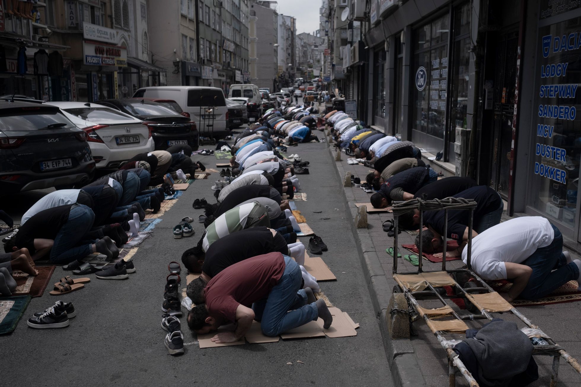 Спустя несколько часов в районе Бейоглу — в той же европейской части — собрались последователи Эрдогана. Это было похоже на праздник жизни в прекрасный весенний день. Из Бейоглу демонстранты плавно переместились к мечети Айя-София, куда их кандидат приехал совершить молитву. Около мечети тоже собралась толпа.