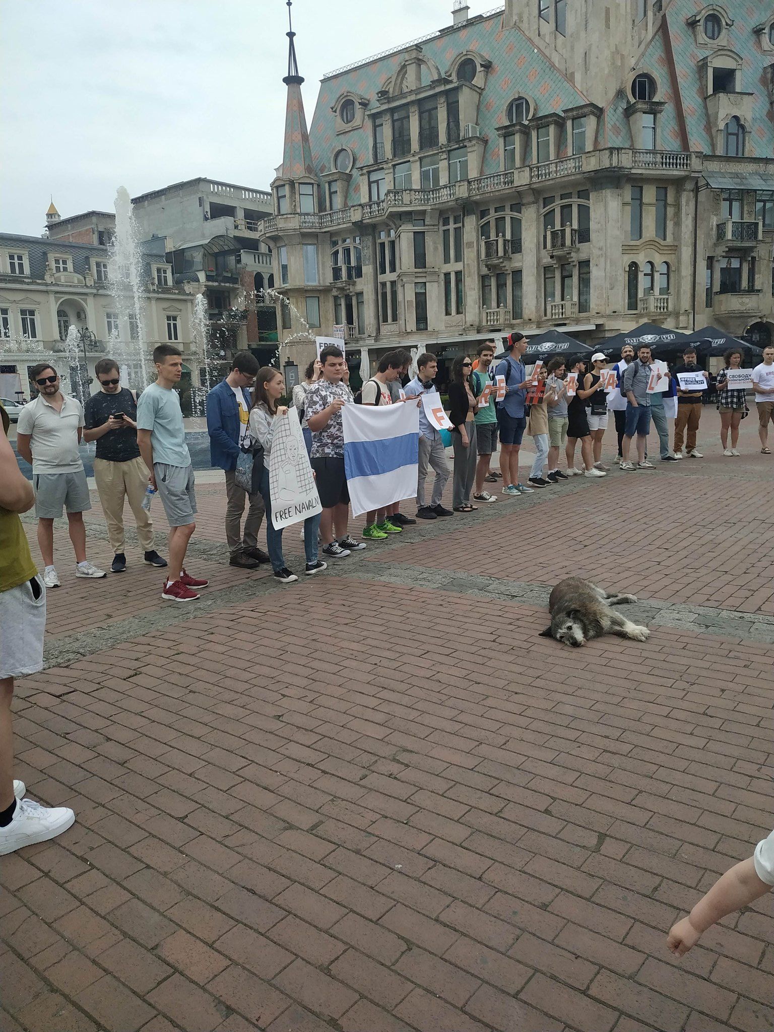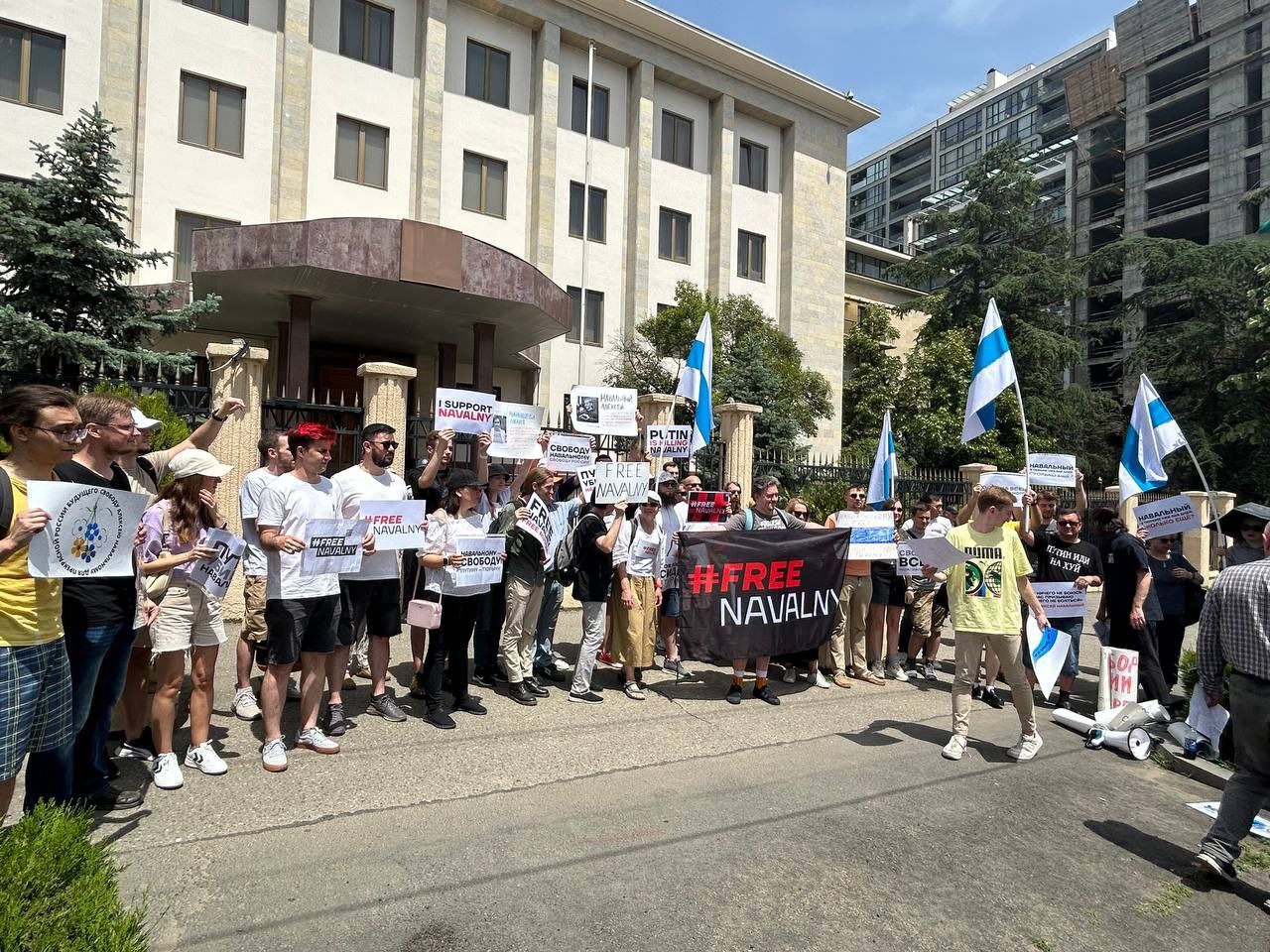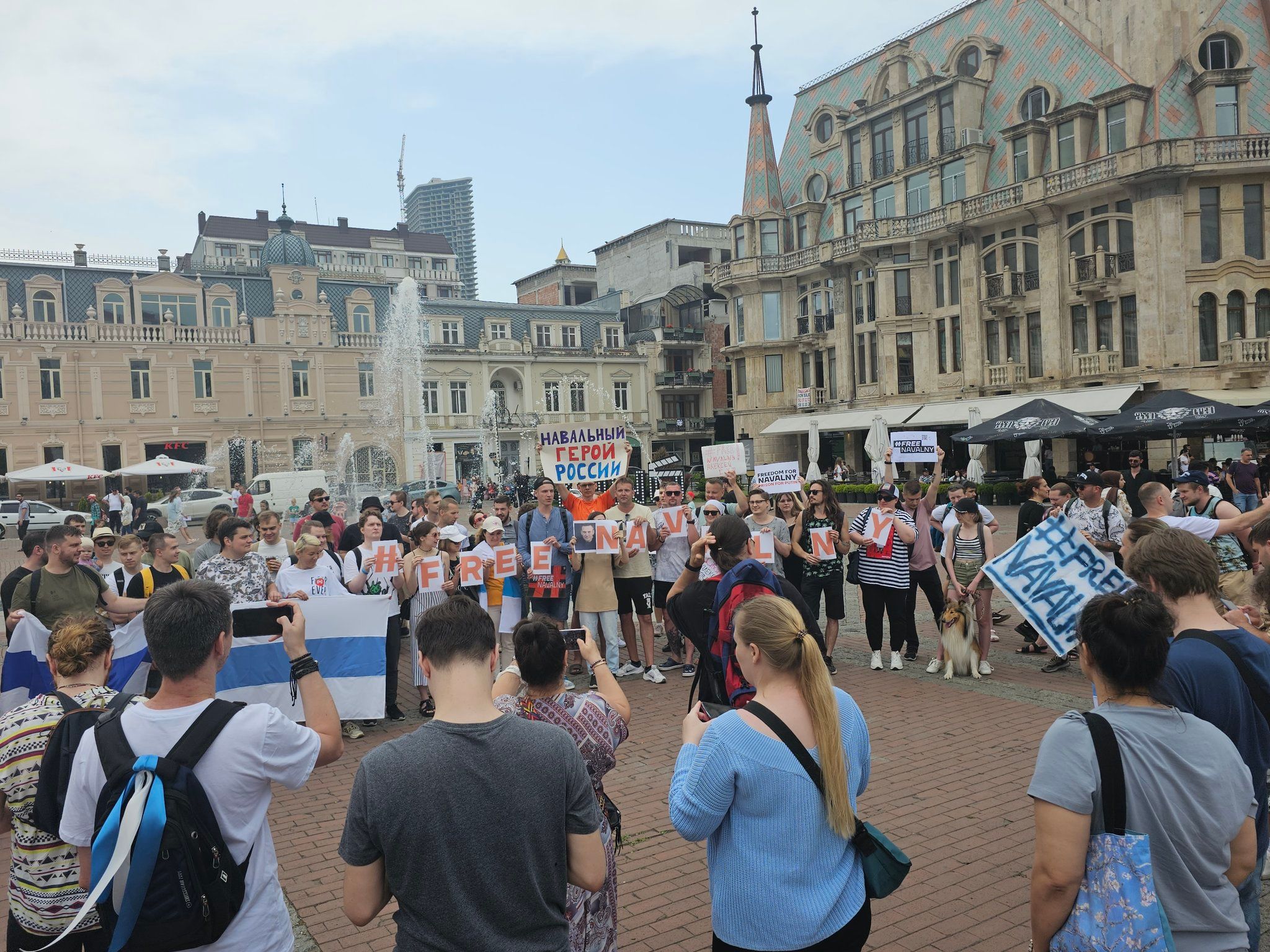 «Дождь» публикует видео с акции в Тбилиси. Собравшиеся скандируют: «Свободу всем политзаключенным» и «Путина в Гаагу».