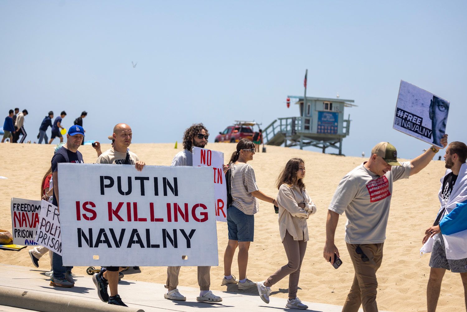 В городе Санта-Моника на западе округа Лос-Анджелес акция в поддержку Навального прошла еще 3 июня. Собравшиеся несли плакаты «Путин убивает Навального» и «Остановите геноцид в Украине».