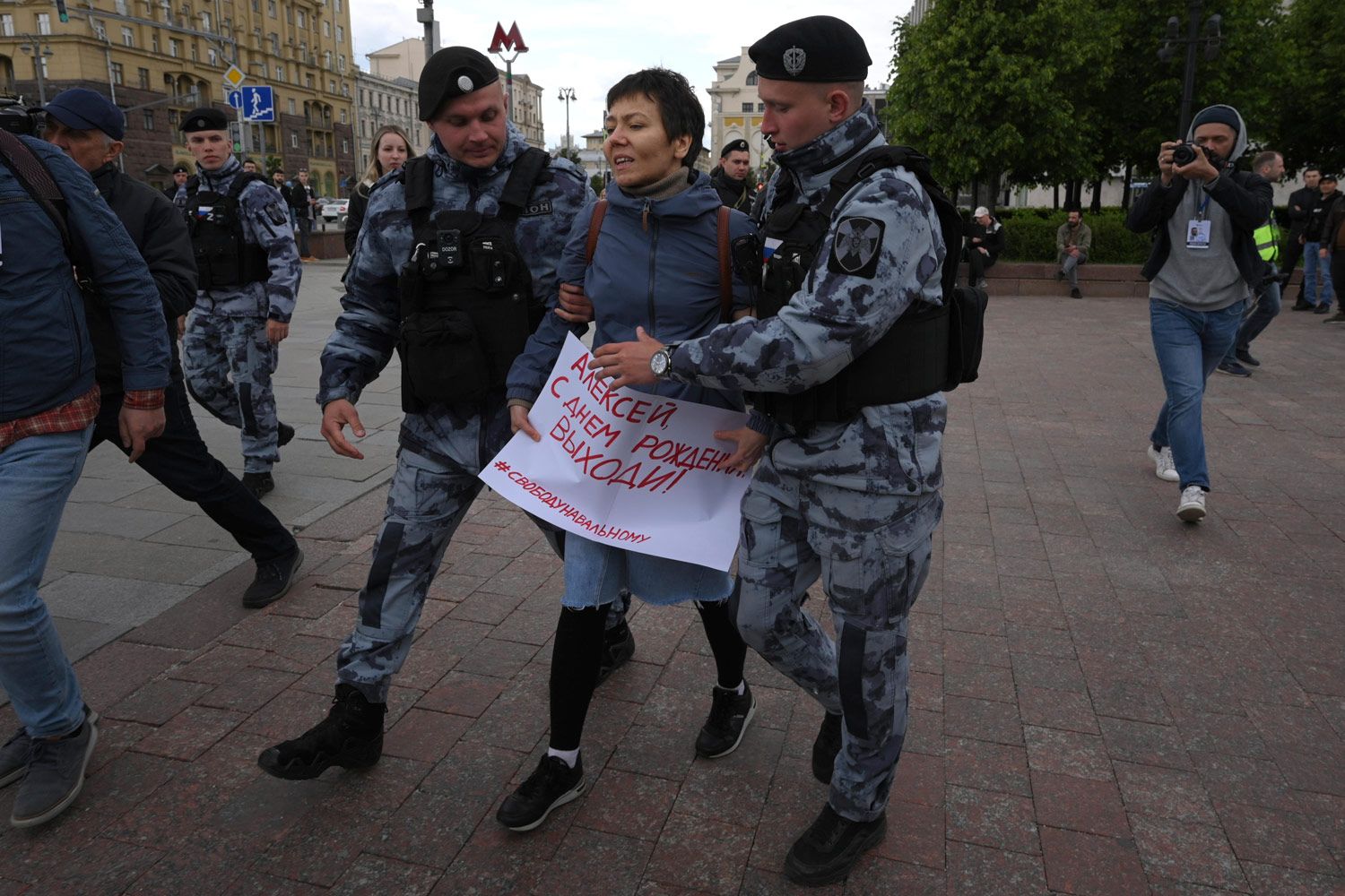 Третий задержанный на Пушкинской площади — мужчина с плакатом «Свободу Навальному».