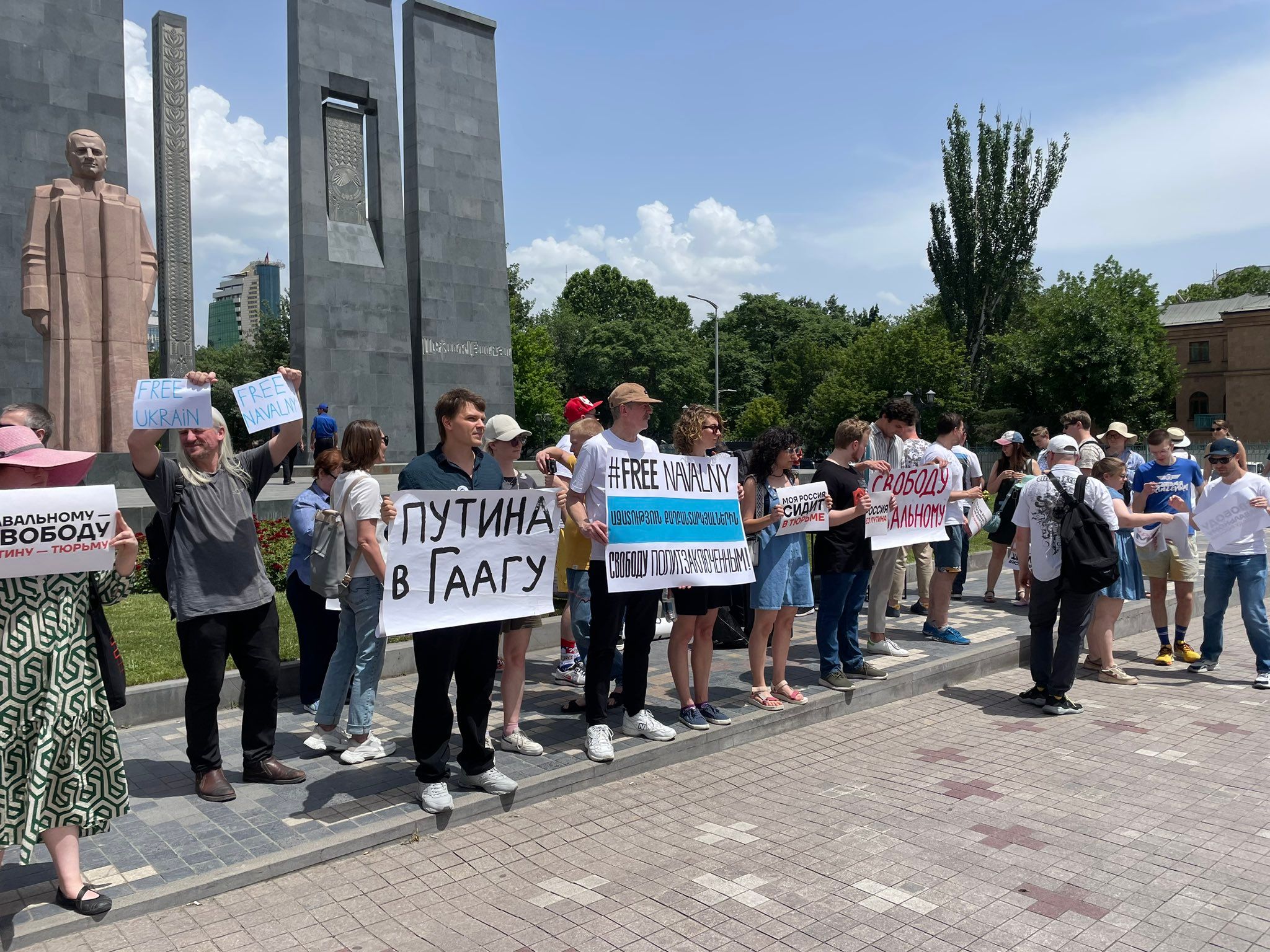 На акции в поддержку Алексея Навального в Ереване собрались люди с плакатами «Путина в Гаагу» и «Моя Россия сидит в тюрьме».