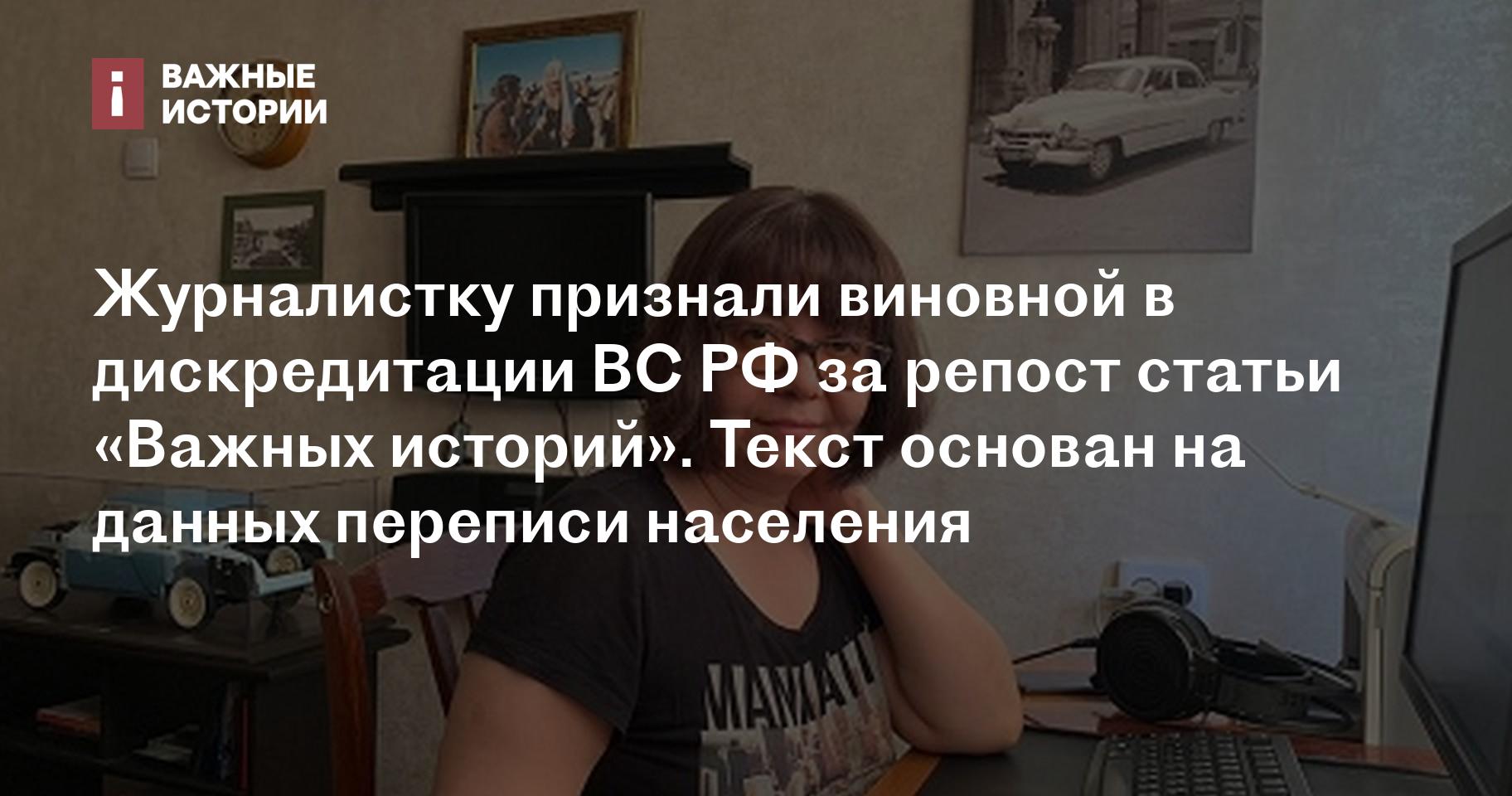 Журналистку признали виновной в дискредитации ВС РФ за репост статьи «Важных историй». Текст основан на данных переписи населения