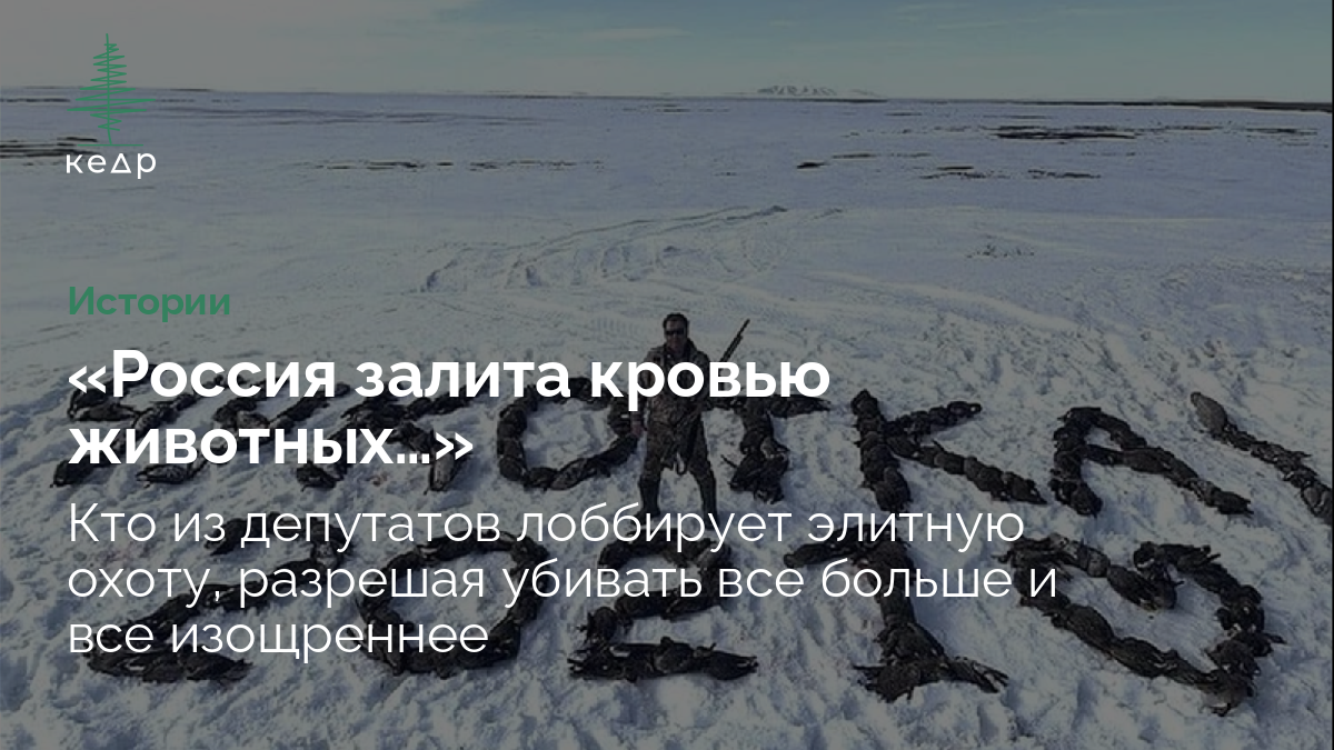 Наконец, в 2022 году был внесен законопроект, авторы которого предлагают: отменить государственную экологическую экспертизу материалов, обосновывающих ежегодные объемы (лимиты, квоты) отстрела охотничьих животных [прим.: Дикие звери, которые по закону отнесены к объектам охоты]; исключить норму о минимальной 20-процентной доли территории охотхозяйства, которая должна быть общедоступной, и передать право определять эту долю региональным властям (эта поправка открывает возможность для запрета охоты простым людям [прим.: «Кедр.медиа» не оправдывает убийство животных в целях развлечения, кем бы ни был охотник] в пользу представителей элиты); а еще обязать арендаторов угодий обеспечивать необходимую «добычу» животных: убитых зверей и птиц или выловленной рыбы должно быть не меньше половины от дозволенного (50% от установленных квот).