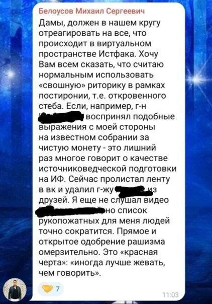 Три дня назад СПбГУ уволил Белоусова, хотя доцент утверждал, что телегам-аккаунт, с которого было отправлено сообщение о рашизме, был создан без его ведома и не принадлежит ему.