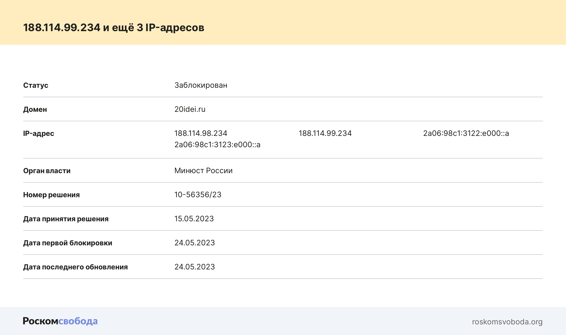 Решение о блокировке сайта «20 идей» было принято 15 мая текущего года, а в реестр его должны были внести, согласно картотеке Роскомнадзора, 24 мая, но фактически это случилось только ночью с 6 на 7 июня: