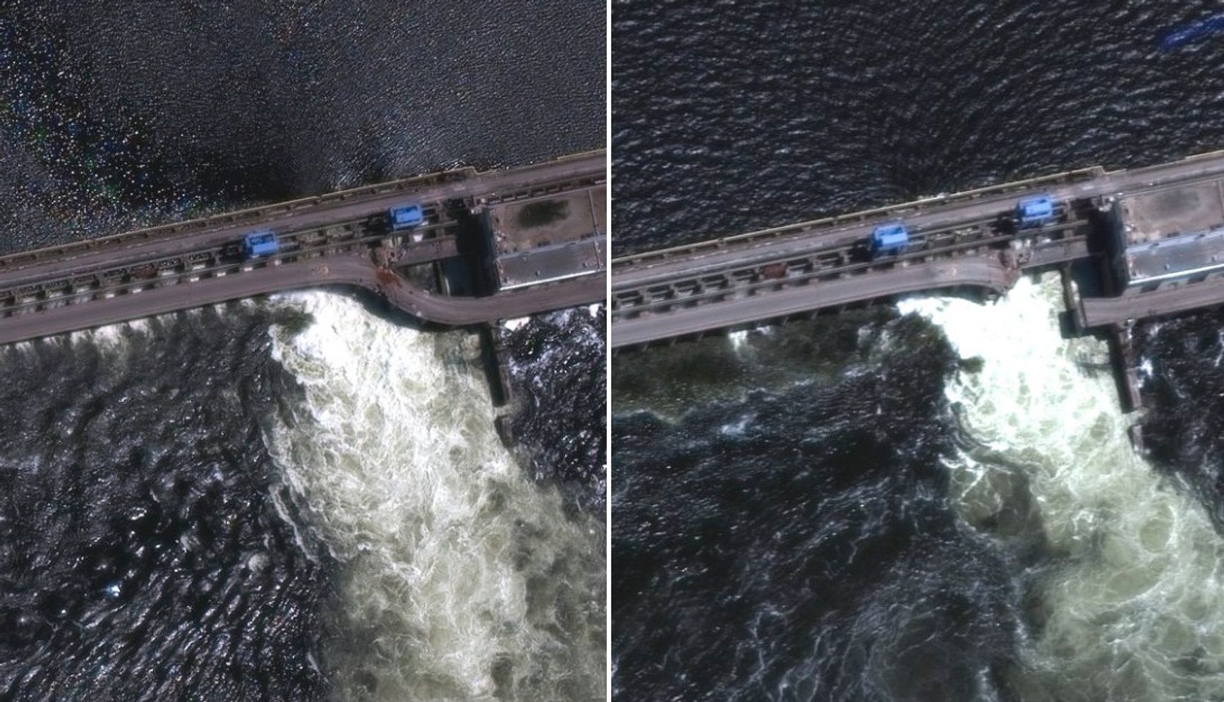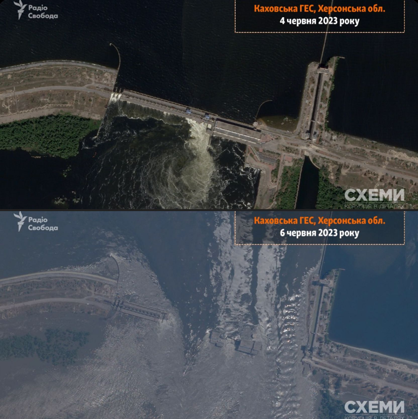 Также украинские СМИ опубликовали спутниковые снимки плотины Каховской ГЭС до и после взрыва (4 и 6 июня).
