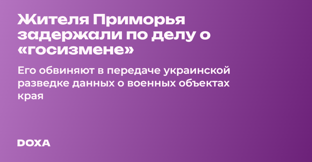 В Приморском крае задержали местного жителя по обвинению в «госизмене»,сообщает РИА«Новости» со ссылкой на ФСБ. По данным ведомства, мужчина передавал украинской разведке сведения, которые могут использовать против «безопасности России».