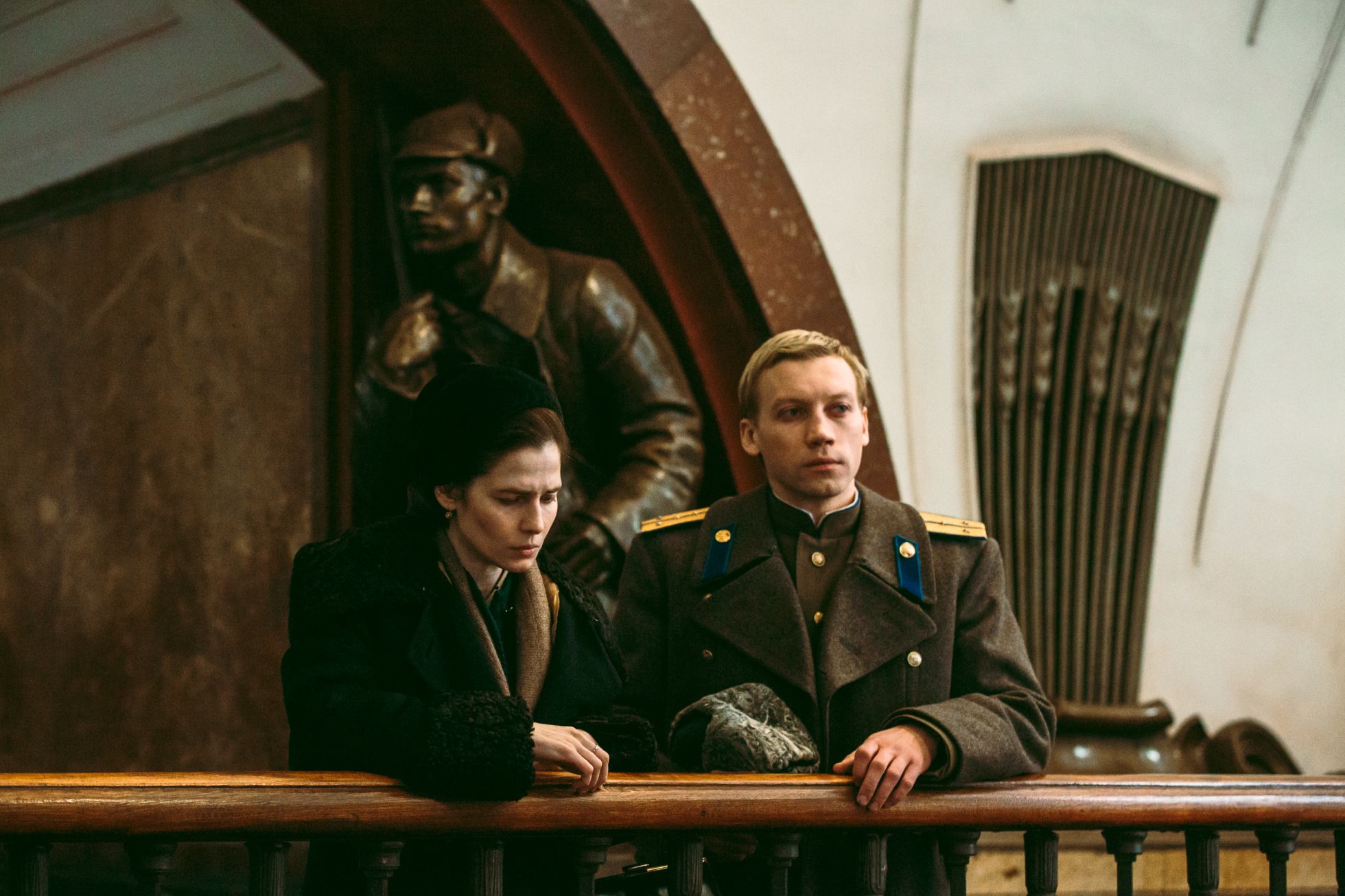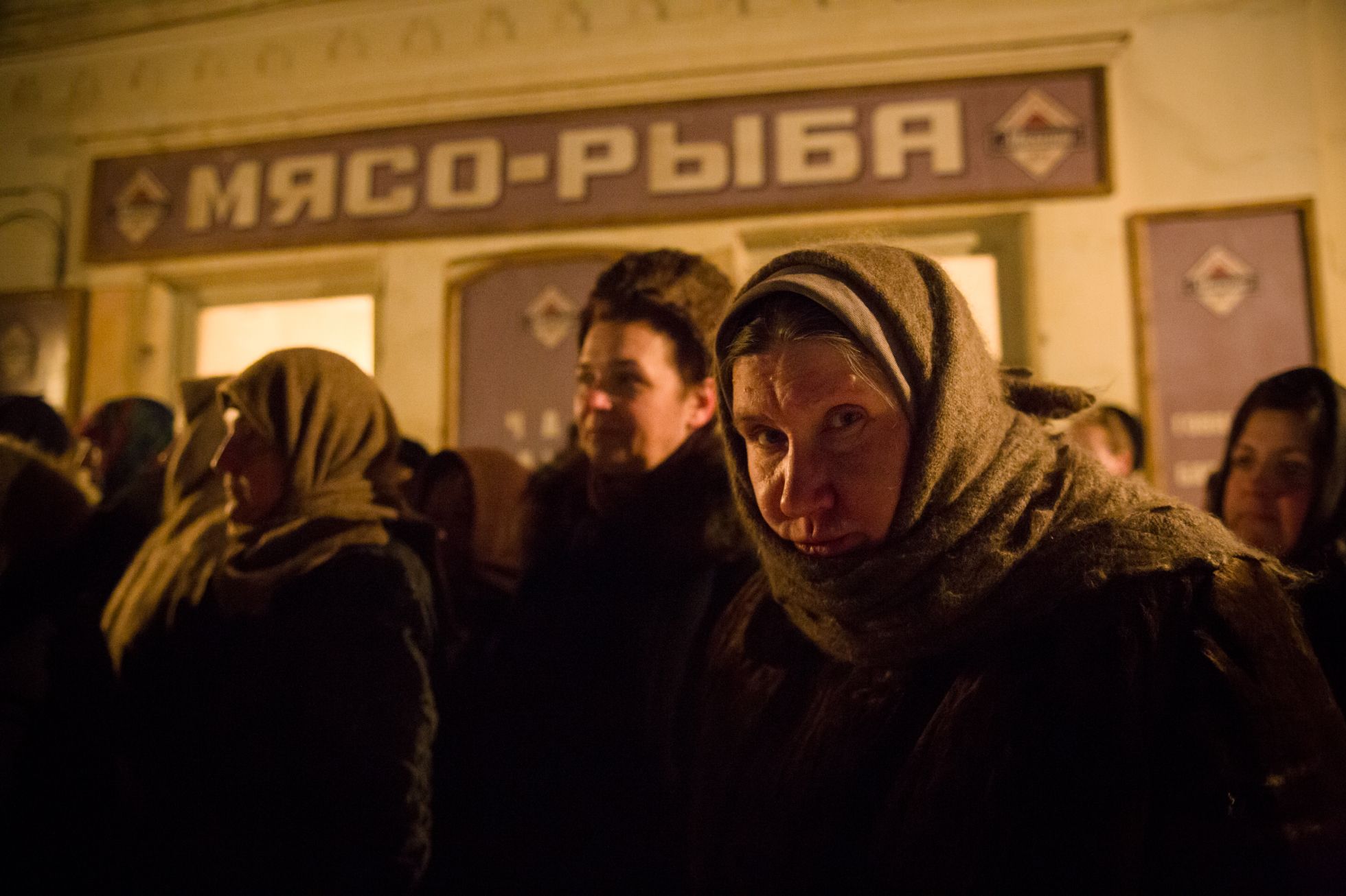 Это сопоставление окончательно уводит картину Смирнова из реалистически-исторического контекста в гротескно-символический. Способствует тому и еще один ключевой сорокинский образ — безразмерная и безликая очередь, где нужно беречь свой «номерок» и приходить по ночам «отмечаться», чтобы его не потерять. Сначала стоят за дефицитными продуктами (хоть мать Дины и пытается стойко держаться за аристократический оливье без картошки), потом — чтобы узнать что-то о попавшем в переплет родственнике, затем — с передачей в окошечко тюрьмы и, наконец, в Колонный зал, попрощаться с вождем. Процесс этот бесконечен, как пьяный танец танкиста с колхозницей под Утесова, в задорных куплетах которого звучит непременное «На Берлин!».