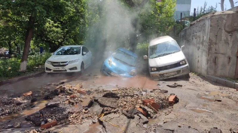 Из-за аварии больше 23 тысяч жителей Владивостока остались без горячей воды, под землю ушли автомобили, залило дорогу и пожарную часть