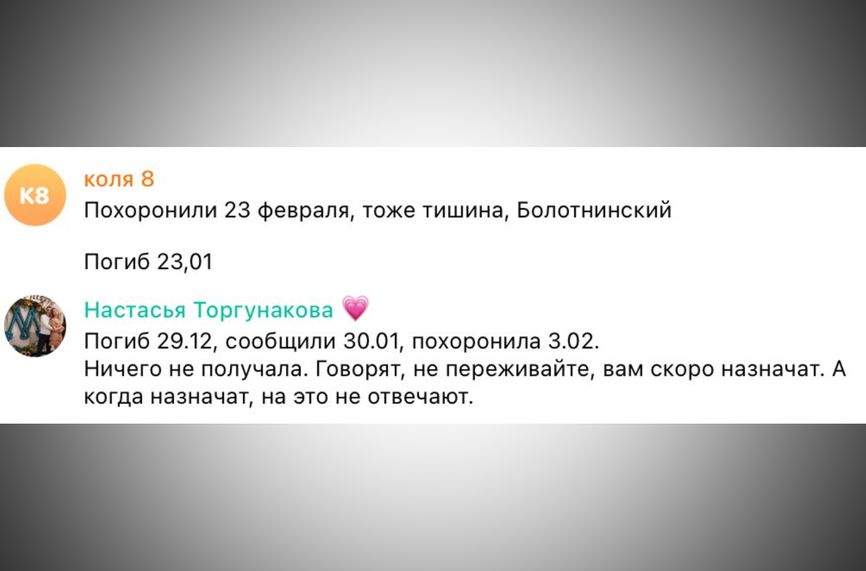"После смерти должны как выплатить похоронные, так и помочь родственникам покрыть расходы на погребение. Но, судя по рассказам женщин, истории которых я читаю в чате, государство часто замалчивает гибель родственников в ЧВК, и их статус остается неподтвержденным. Это позволяет не начислять похоронные выплаты, еще и зарплату перестают начислять. Получается, что они в курсе их гибели", – рассказала The Insider родственница одного из погибших заключенных.
