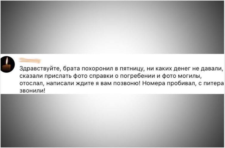 Для того чтобы получить гробовые, родственникам завербованных заключенных нужно обратиться к "куратору". Кстати, сами родственники не используют слово "гробовые" – только "похоронные". Но и с их получением чаще всего возникают проблемы. Иногда, как в случае с "Сергеем", близким погибших дают обещания, которые очень неохотно выполняются. Иногда людей и вовсе обманывают. Одна из участниц чата рассказала, что получила на похороны супруга на 100 тысяч рублей меньше. В некоторых случаях родственникам, живущим в регионах, нужно ехать в ближайший город, где есть "касса" (так, судя по всему, называются пункты, ответственные за бухгалтерию ЧВК Вагнера).