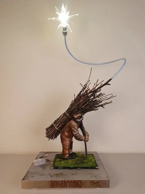 Лампа существует в двух воплощениях. Вы видите оба. Первое — старичок несет на спине вязанку хвороста. Он делает это уже лет сто пятьдесят и привык. Хворост для лампы — настоящий хворост — художник Владимир Никишин, товарищ Мастера Света, нарезал секатором в парке неподалеку от Братской ГЭС. Второе — за спиной старика, изгибаясь, вырастает Stairway to Heaven. Но есть еще и третье воплощение, подразумеваемое, живущее в мысли и мечте, — в одном из скверов Лондона, посредине которого Мастер Света намеревается когда-нибудь поставить эту свою лампу. Старичок там будет иметь человеческий рост, лестница за его спиной будет изгибаться к верхним этажам зданий, а лампа в форме звезды поднимется выше крыш и засияет всем, кто слушал и слушает Led Zeppelin.