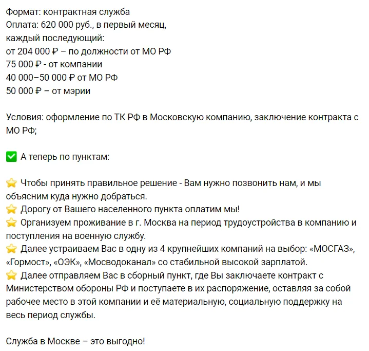 В этих учреждениях также рассказали об условиях службы — везде пообещали выплачивать 75 тысяч рублей ежемесячно и от 150 до 200 тысяч рублей единоразово сверх денег от Минобороны. Кроме того, компании пообещали сопровождать добровольца все время до подписания контракта.