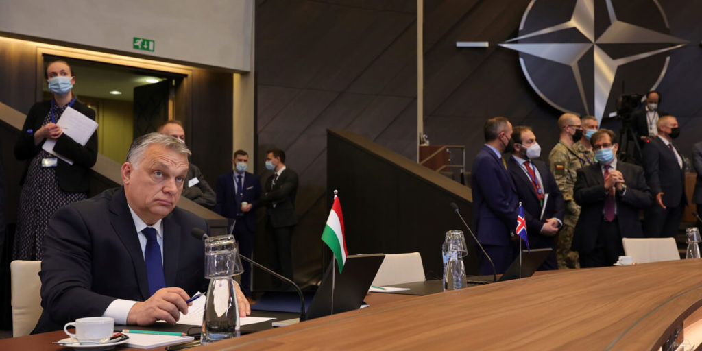 Виктор Орбан принимает участие в виртуальном саммите лидеров НАТО в штаб-квартире НАТО в Брюсселе.