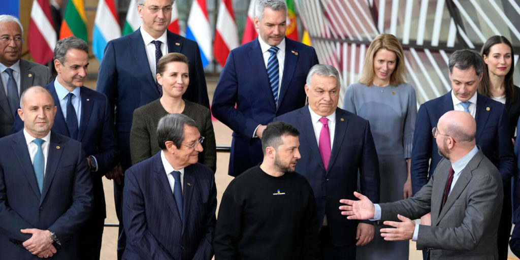 Председатель Европейского совета Шарль Мишель беседует с президентом Украины Владимиром Зеленским и премьер-министром Венгрии Виктором Орбаном во время группового фото с другими лидерами Европейского Союза на саммите ЕС в Брюсселе. Фото: Virginia Mayo / AP Photo / Scanpix