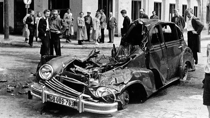 Раздавленный танком автомобиль на улице Берлина. Фото из открытых источников