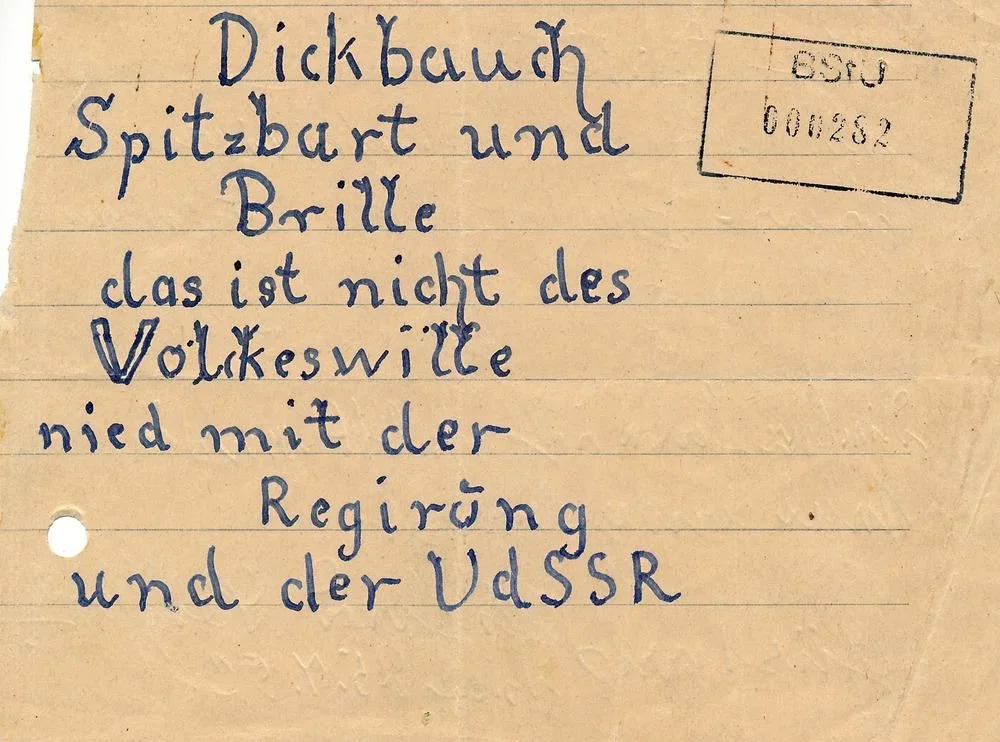 Вот пожелтевший клочок бумаги из архива спецслужбы, который агенты, а сначала, наверное, их добровольные помощники нашли на заводе в Гюстрове. На его основании окружное управление государственной безопасности 25 июля 1953 года выдало ордер на арест за «подрывную деятельность на рабочем месте» и «разжигание ненависти». Это даже не печатная листовка, а коряво написанная от руки речовка: «Козлиная бородка, живот и очки — это не воля народа!» Помните, про Ульбрихта, Пика и Гротеволя? Плюс приписка: «Долой правительство и СССР».