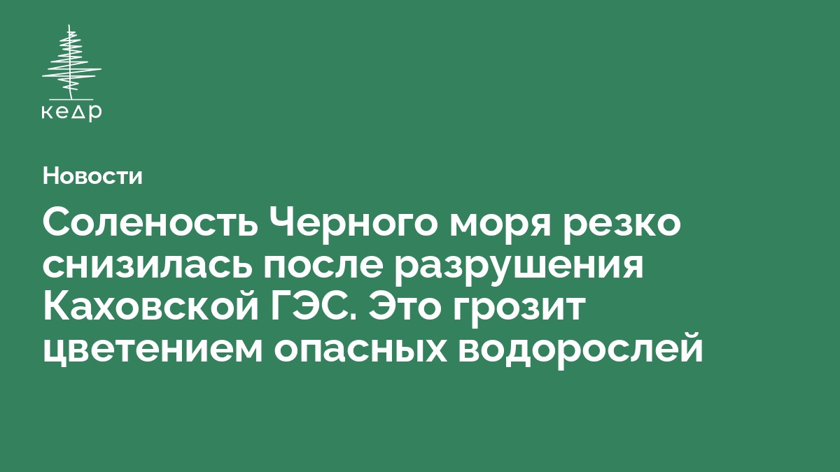 Эколог Евгений Симонов* отмечает, что снижение солености однозначно связано с разрушением Каховской ГЭС. «Туда залилось более 10 кубических километров пресной воды, и она сейчас перемешивается с морской. Годовой сток Днепра — около 55 кубических километров, а тут сразу плюс 10 за неделю», — сказал «Кедру» Симонов.