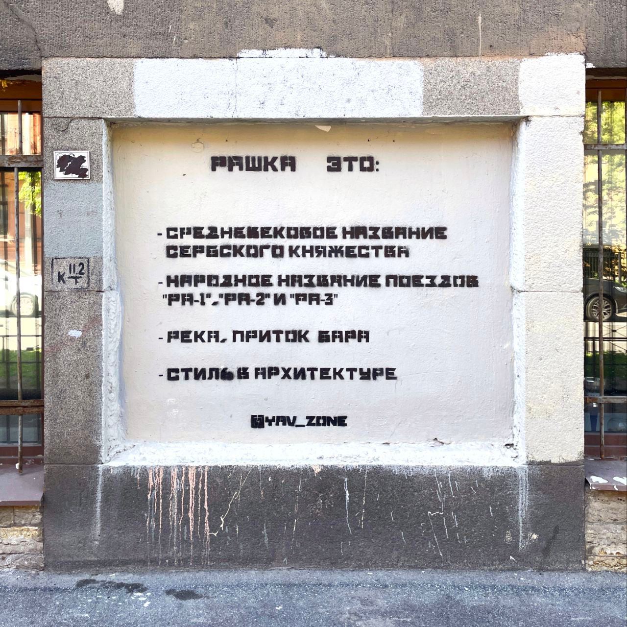 Арт-группа «Явь» разместила на 9-й Советской улице работу «Рашка». «Уважаемые россияне, давайте разделять страну и государство, ведь как сказал Шевчук: „Россия, это не жопа президента!“», — говорится в описании работы. Стрит-арт продержался около двух часов, после чего его испортил неизвестный горожанин, а затем закрасили коммунальщики.