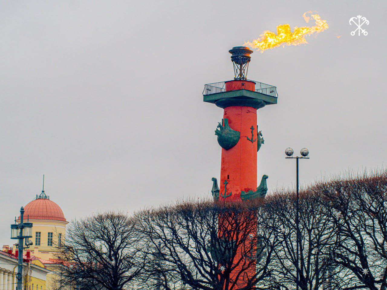 Днем на Стрелке Васильевского острова зажгли огни Ростральных колонн.