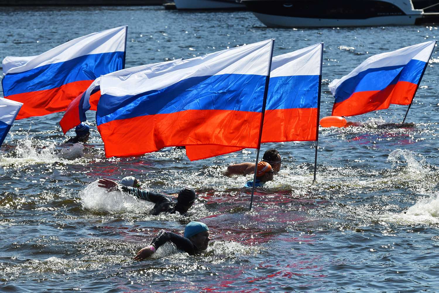 На Елагином острове прошел массовый заплыв «Виват, Россия!», участники которого проплыли дистанцию с флагами России и Петербурга.