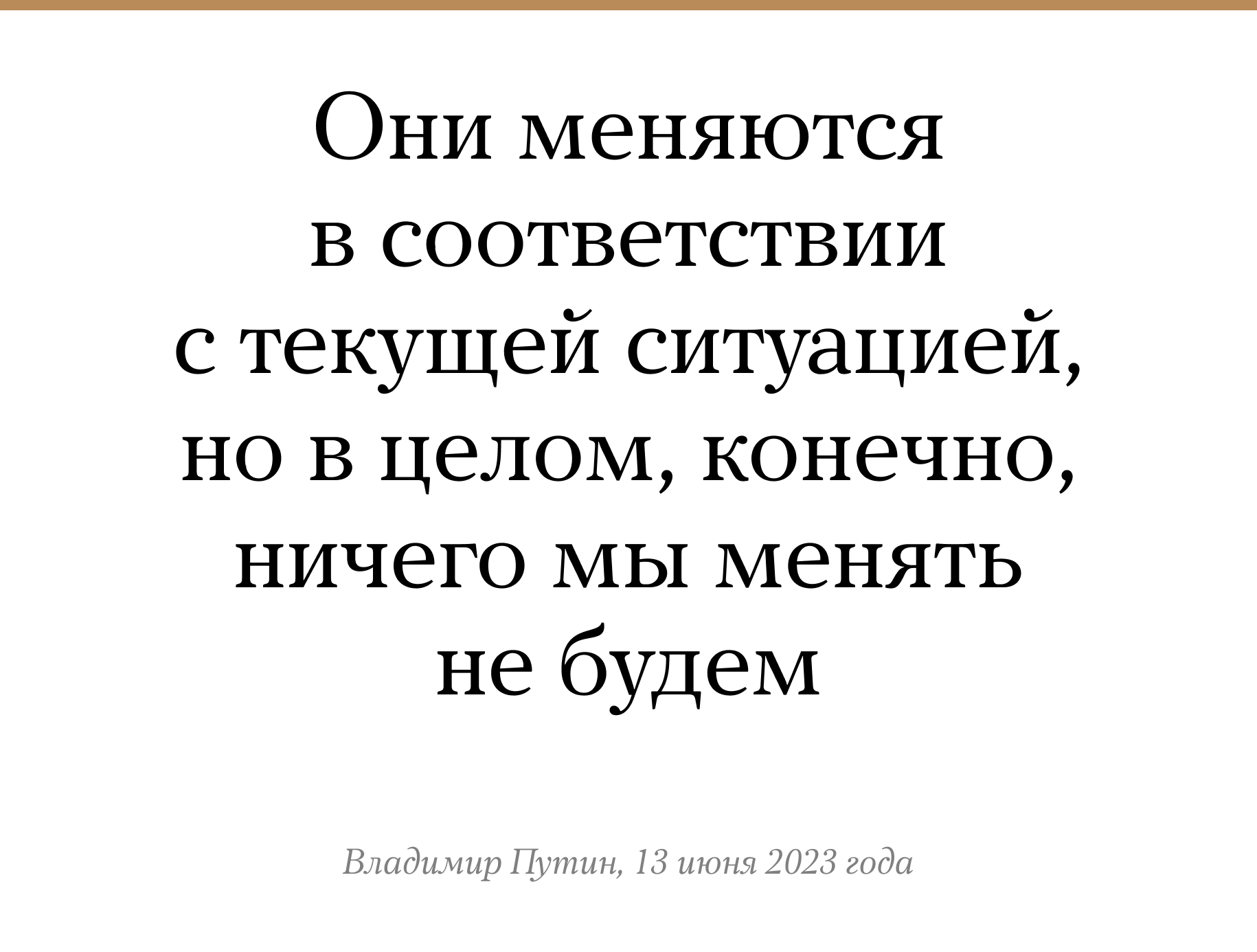 На встрече Владимира Путина с «военкорами» корреспондент Евгений Поддубный задал президенту вопрос, как меняются цели и задачи «специальной военной операции» (то есть войны), которую Россия ведет против Украины. «Вы не раз говорили о том, что в ходе специальной военной операции все цели, которые вы лично ставили, они будут достигнуты. Специальная военная операция уже идет довольно долго. Меняется обстановка, меняется положение, меняются, наверное, и цели, и задачи специальной военной операции. Скажите, как они изменились и изменились ли?» — спросил Поддубный. Путин ответил: «Они меняются в соответствии с текущей ситуацией, но в целом, конечно, ничего мы менять не будем, и они для нас носят фундаментальный характер». В чем заключается фундаментальный характер этих целей и задач, президент России не пояснил.