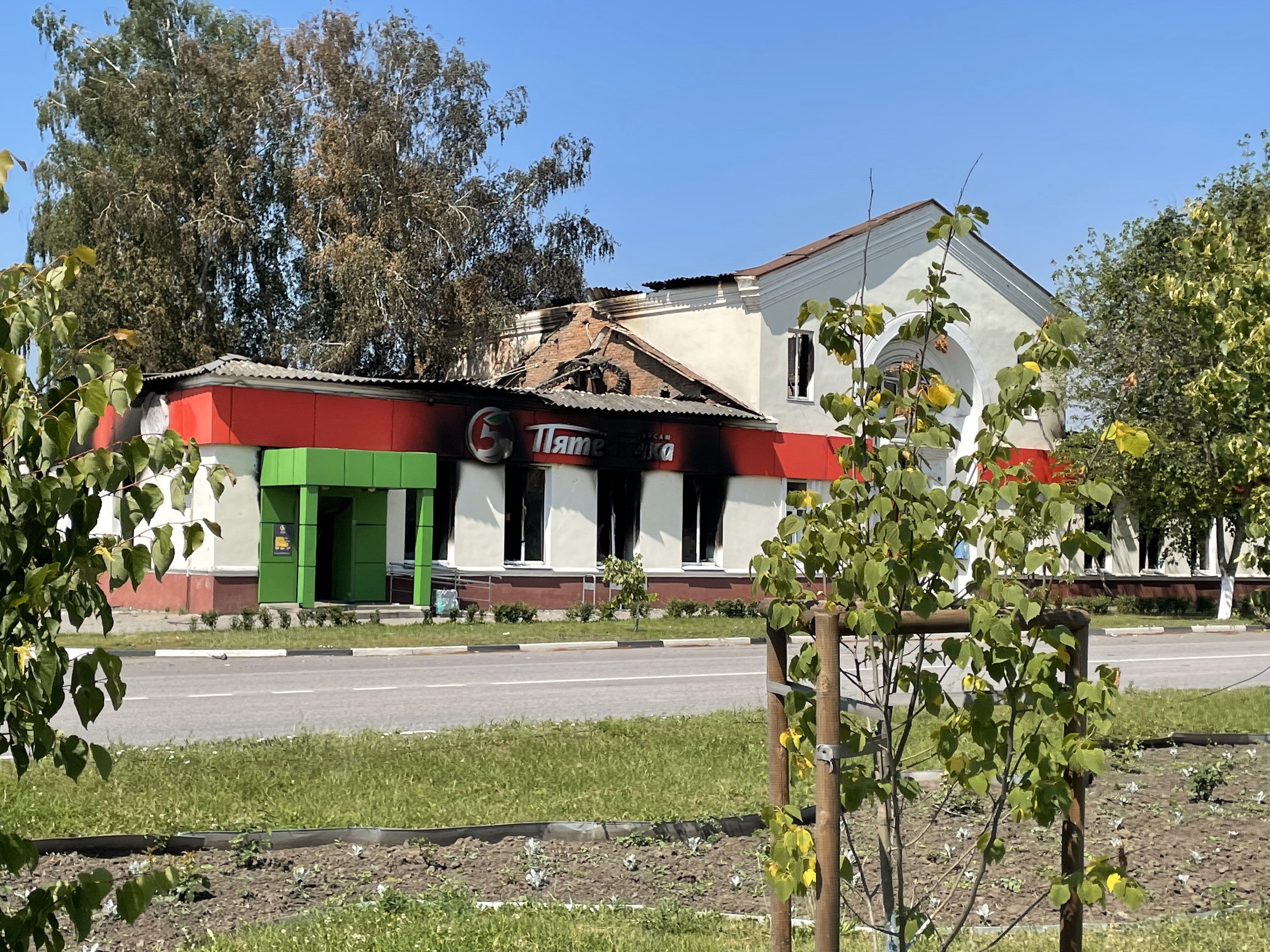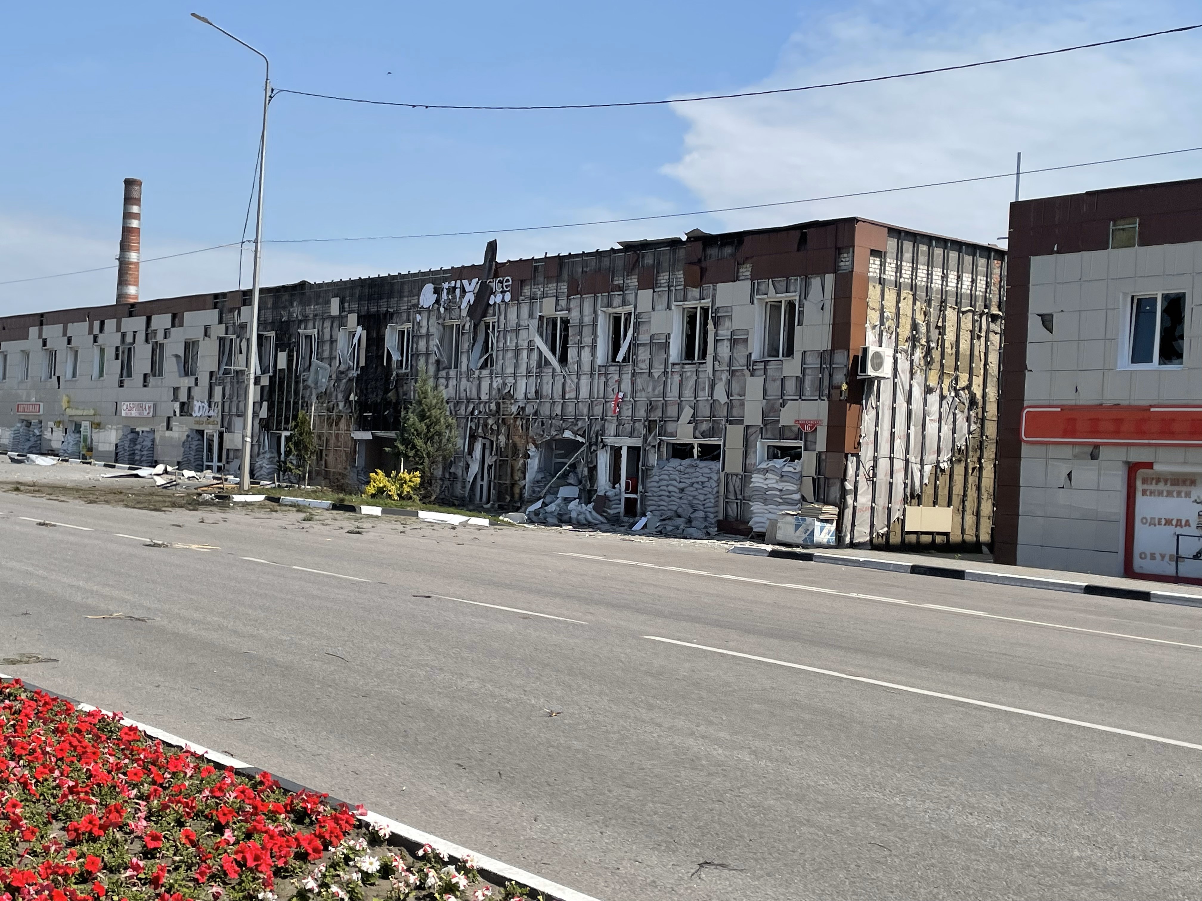 На одной из центральных площадей Шебекина раньше была красная надпись "Победа". Остался только каркас. На фоне догорает бизнес-центр. Огня не видно, но дым еще идет. Подходит улыбчивый местный житель, лет сорока на вид, представляется Алексеем и говорит, что уезжать из Шебекина не собирается.