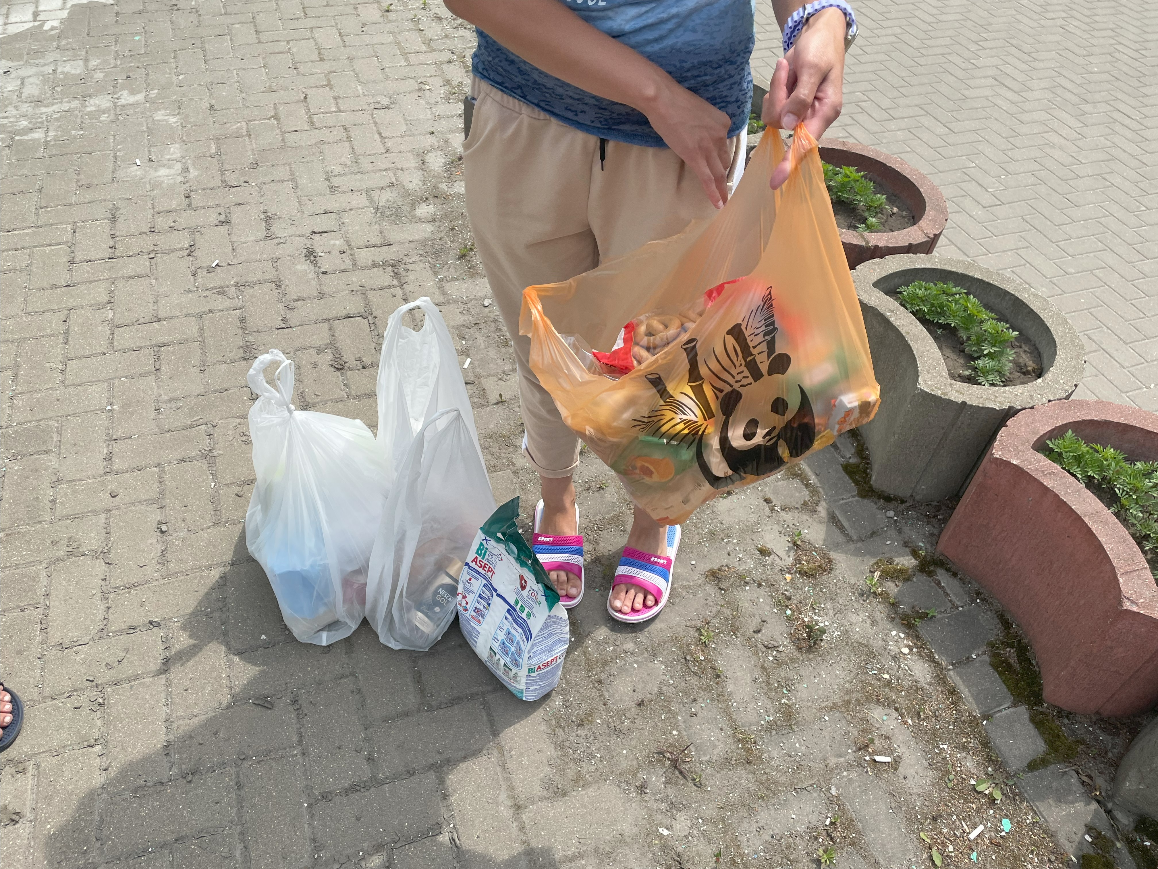 Они из самого Шебекина, не представляются, но охотно показывают "детский набор" (оранжевый пакет), где сушки, баранки и конфеты. В остальных пакетах – консервы, кофе, туалетная бумага, стиральный порошок.