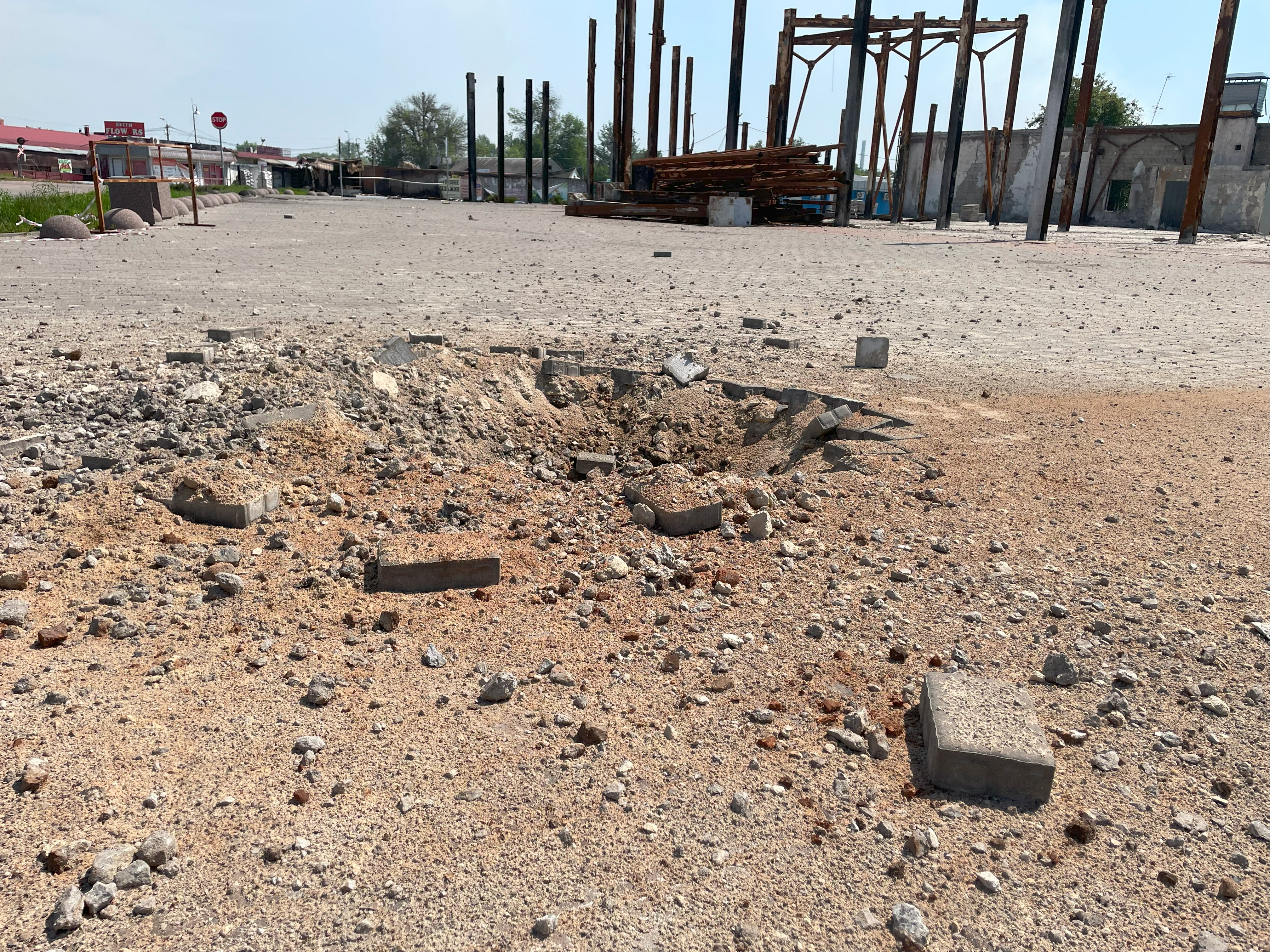 Большинство торговых точек перекрыты мешками с песком. Центральный рынок уже не работает. Рядом сгоревший еще в октябре 2022-го ТЦ "Галерея". Возле него новая воронка. Чуть поодаль останавливается темно-синяя "Хонда". В ней человек в камуфляже, но без бронежилета. Скорее всего, член теробороны.