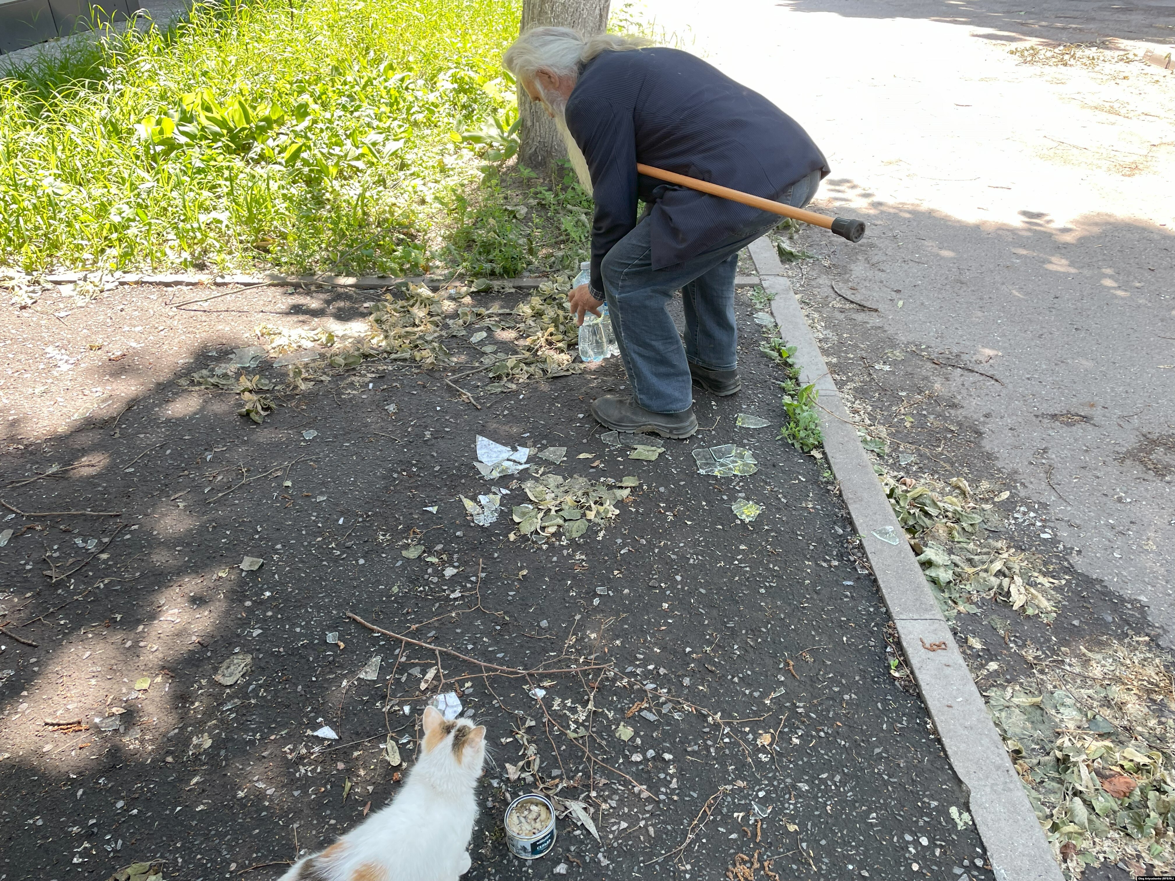 Через полкилометра корреспондента остановил пожилой человек с длинной седой бородой, на груди у него георгиевская лента и российский флаг. Под ними – медаль "Ветеран труда". В руках открытые рыбные консервы – ищет кошек, которые раньше жили в его дворе. Больше всего переживает за Рыжика и просит помочь найти его.