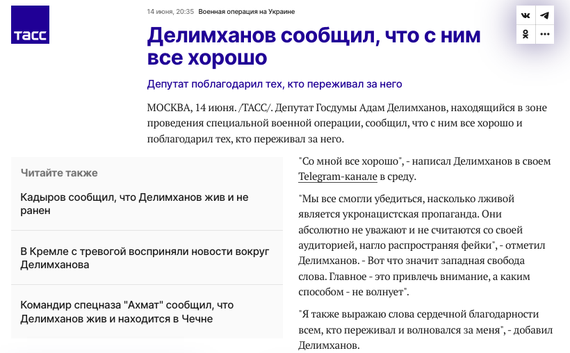 Контекст. О гибели Делимханова утром в среду сообщил украинский журналист Кирилл Сазонов. По его данным, украинская разведка нанесла удар по кортежу внедорожников, в котором был Делимханов. Первым это заявление опроверг канал Минобороны «Звезда», который сообщил, что Делимханов был ранен, но остался жив. Этот материал несколько раз переписывали.
