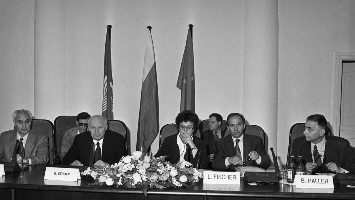 1997 год. «Невский саммит». Председатель совета МПА СНГ Егор Строев (в центре) и председатель межпарламентской ассамблеи Совета Европы Лени Фишер. Фото: Иван Куртов / Фотохроника ТАСС