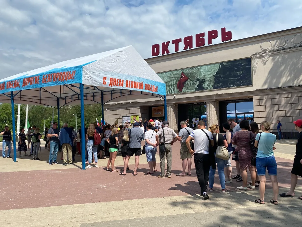 Длинная очередь выстроилась под тентом с поздравлением: «С Днем Великой Победы, белгородцы!» Из дверей здания «Октября» выходят дед с мальчиком, у деда в руках — прозрачное ведро, в нем — туалетная бумага, пачки влажных салфеток и зубная щетка. Садятся рядом. Дед закуривает. К нам на скамейку подсаживается женщина с двумя пакетами — из одного под ноги выпадает пачка «Роллтона». Она наклоняется за ней — и не выдерживает. Слезы сами вырываются: