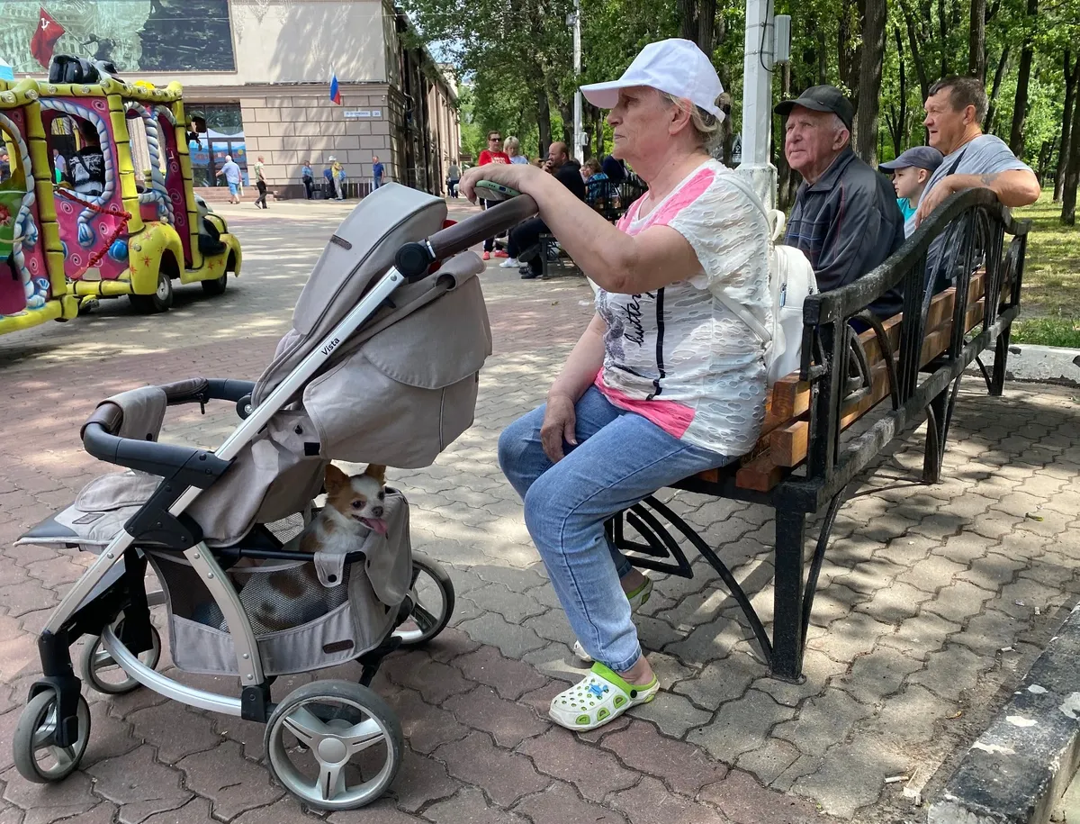 Рядом на скамеечке женщина, у нее маленькая шляпка и такая же маленькая сумочка в руках, она ждет дочку из очереди, показывает куда-то на вход: «Вот женщина в зеленом идет, она с Новой Таволжанки. Она рассказывала: мы из дому выглядываем, а у нас военные под окнами стоят. Говорят: «Быстро уезжайте». Они в машину прыгнули и все, вообще ничего не взяли… Дочка вечно с телефоном. Туды-сюды. Я ей чего-то говорю, она вообще не слышит меня. Пойдем кушать, она мне — «сейчас». Я говорю: успокойся, а то давление бахнет. Конечно, переживает. Говорит мне: